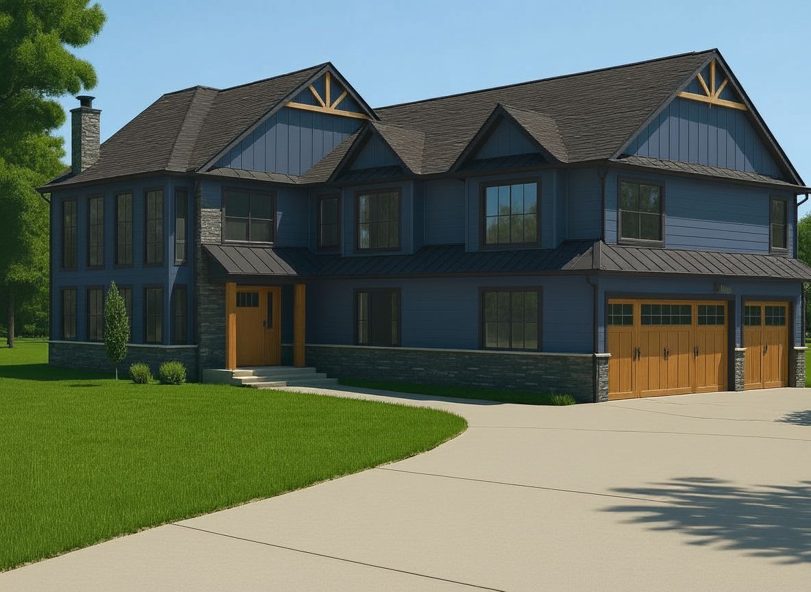 siding to be color dark grey blue 2b2b48 all wood to be same color brown wood stone to extend above left entrance door