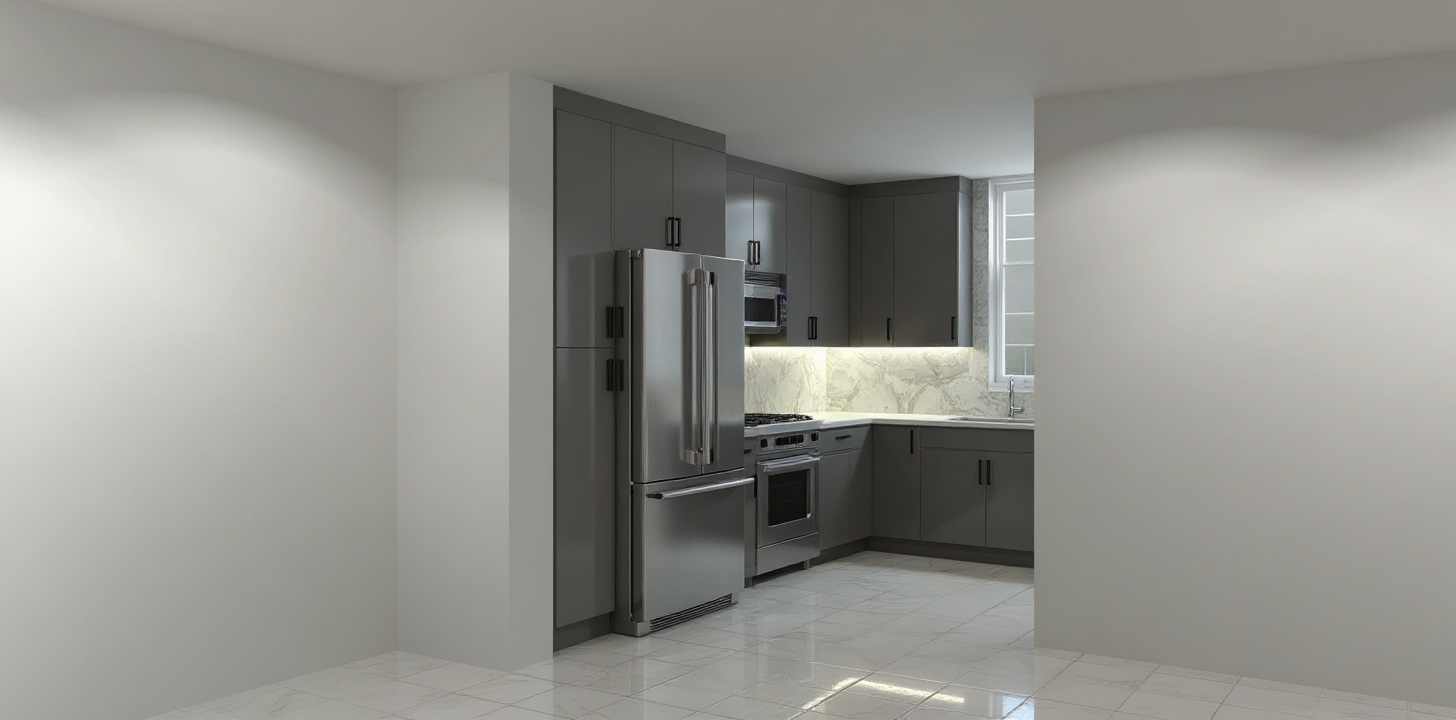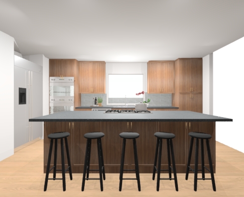 countertops should mimic quartz lumataj and have a double waterfall edges there is no void above the fridge as shown in the picture i provided appliances are kitchenaid black stainless sink is black stainless undermount faucets and cabinet pulls are aged brass the cooktop doesnt have any grilles its electric induction style flooring should reflect clay imports cotto sienna 13x13