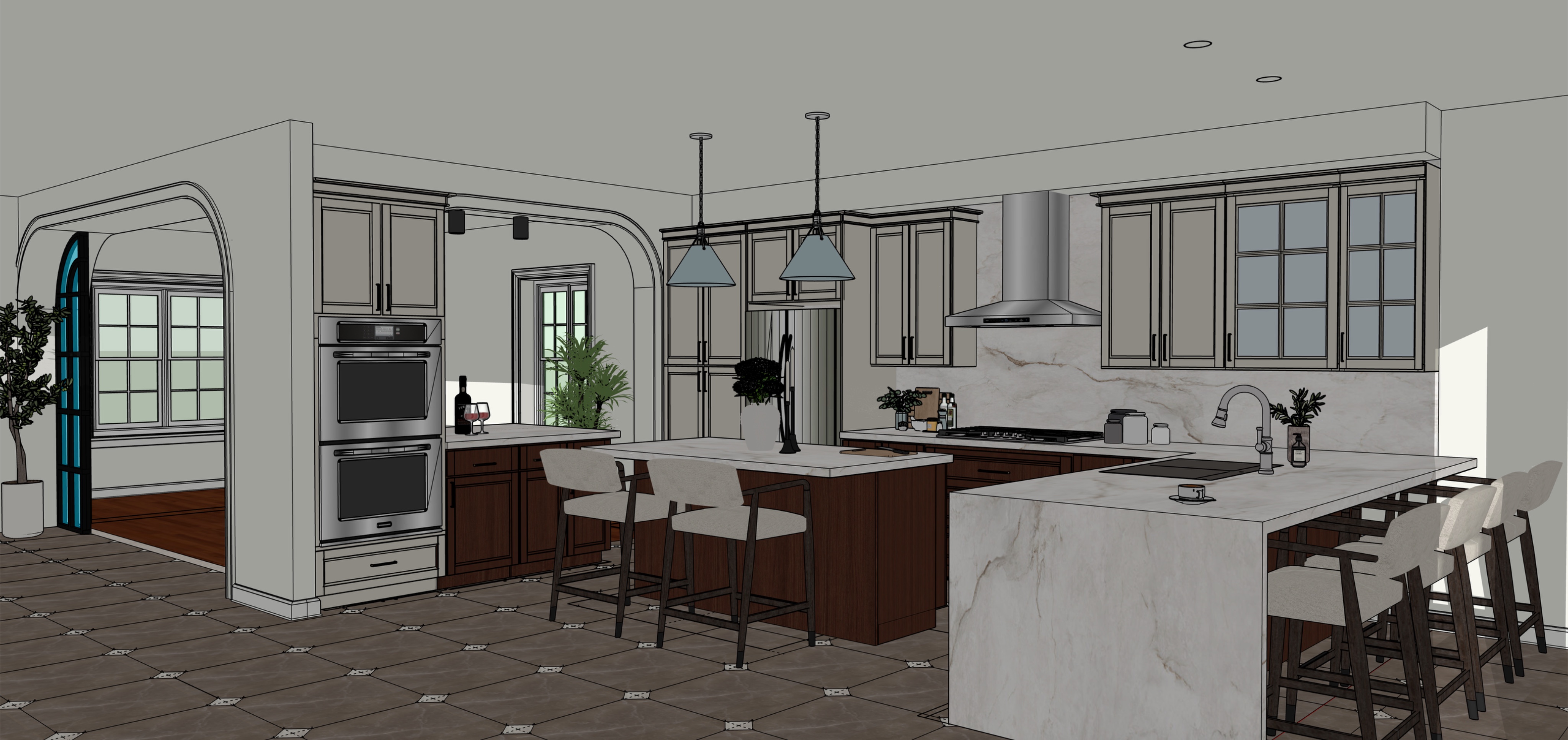 create a photorealistic rendering of the uploaded sketchup interior model preserve the exact layout geometry and proportions of all elements cabinets island windows walls and doors do not change materials colors finishes or textures use soft natural daylight coming through the windows supplemented by subtle artificial lighting under cabinets and above materials should appear tactile and realistic cherry wood grain cream painted cabinets quartz countertops taupe porcelain tile floors baby blue pendants with chrome hardware polished nickel hardware on all cabinets eggshell walls and fabric textures include realistic reflections and shadows space should feel warm calm minimal and uncluttered camera angle at human eye level composed like professional interior photography high quality architectural visualization no redesign of geometry or materials