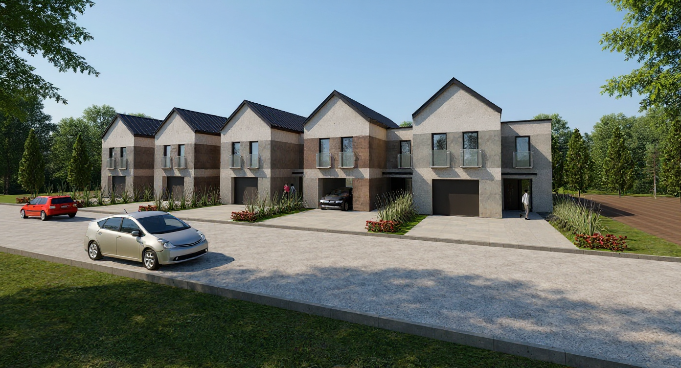 update the ambiance to a photorealistic image keep all original features of the building show people walking on a sunny winter and snow day with a few clouds and snow the longer facade has only parking opening grills no glass