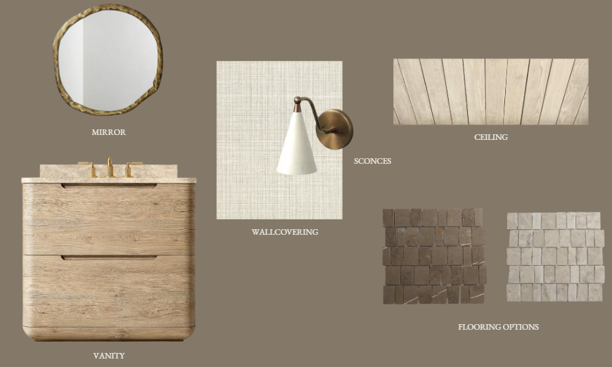 turn this mood board into a powder bathroom using those materials and selections as well as a toilet to the left of the vanity