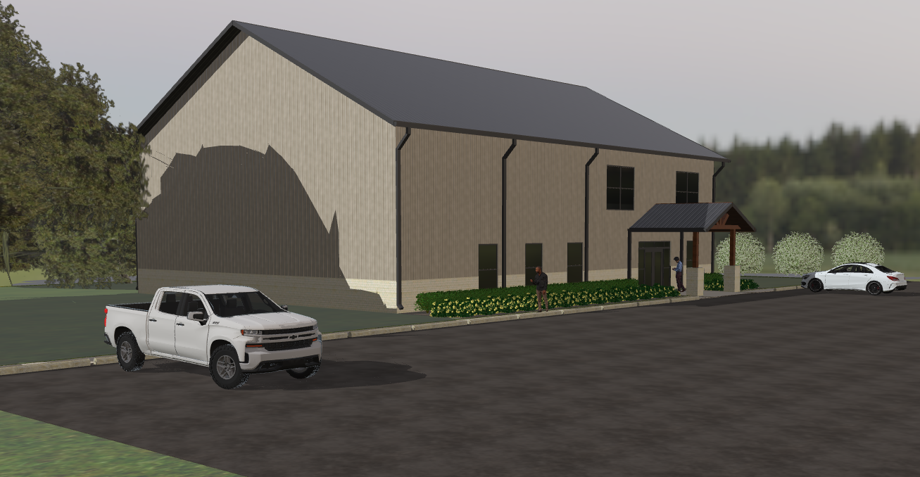 make the weather partly cloudy the walls are tan metal siding with a 4 tan brick wainscoting