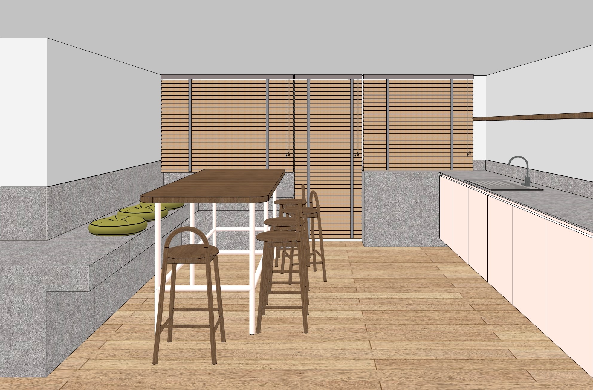high end architectural render of a minimalist basement interior warm and cozy atmosphere on the left wall closed faux blinds with no natural light passing through primary illumination comes from a subtle integrated led strip placed behind the blinds creating a soft warm glow there s no strip led on ceiling primary illumination comes from an abat jour and a floor lamp mood intimate moody clean lines soft shadows photorealistic 8k resolution
