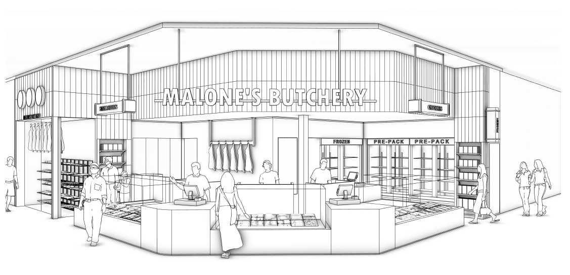 daytime timber bulkhead illuminated letters acrylic stone counter meat in display counters lamb carcass hanging