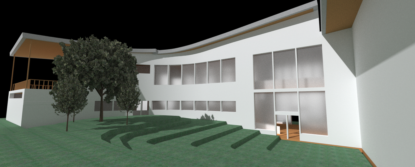 alvar aalto exterior shot curved plaster wall wooden ceiling on grassy hill architecture