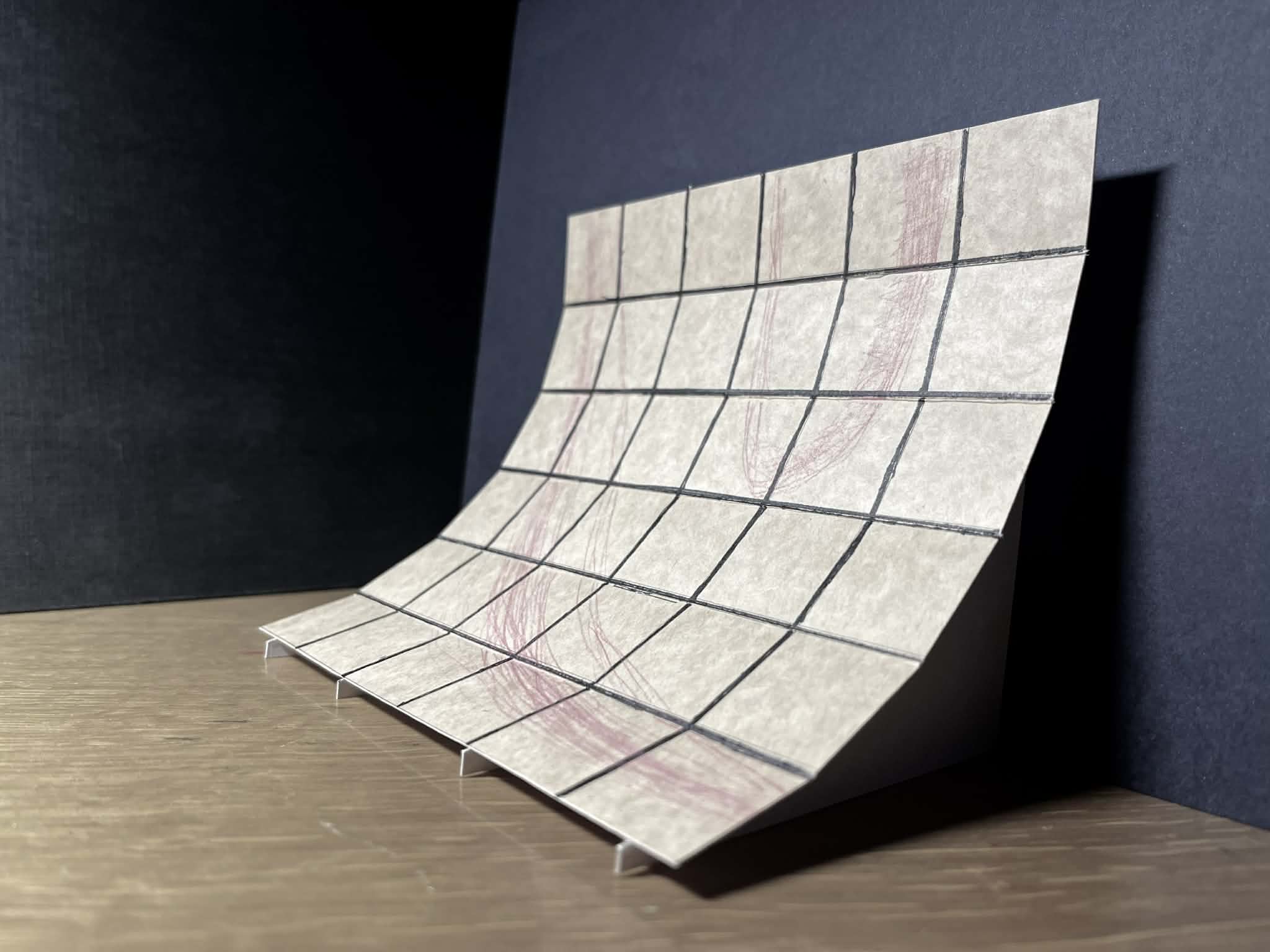 planchas cer micas de terracota no son planas tienen una serie de abombamientos y pliegues que producen juegos de luces y sombras hay una serie de l neas que marcan esas ondulaciones que tienen continuidad entre varias placas est n apoyadas sobre una estructura de madera casi imperceptible est situada en una sala con las paredes y techo pintadas de gris oscuro y el suelo es de tarima de roble con barniz mate con las tablas paralelas a la pieza generar ondulaciones en las zonas que est n ralladas