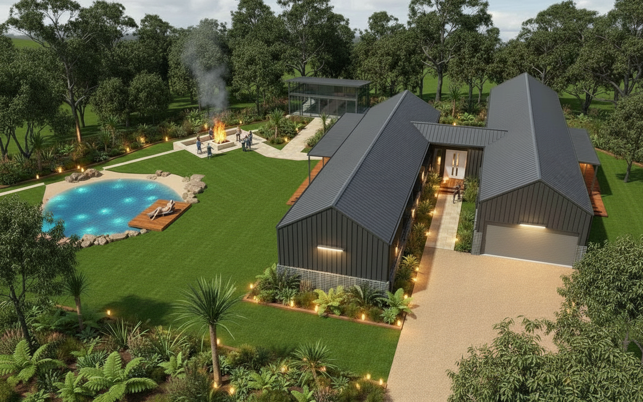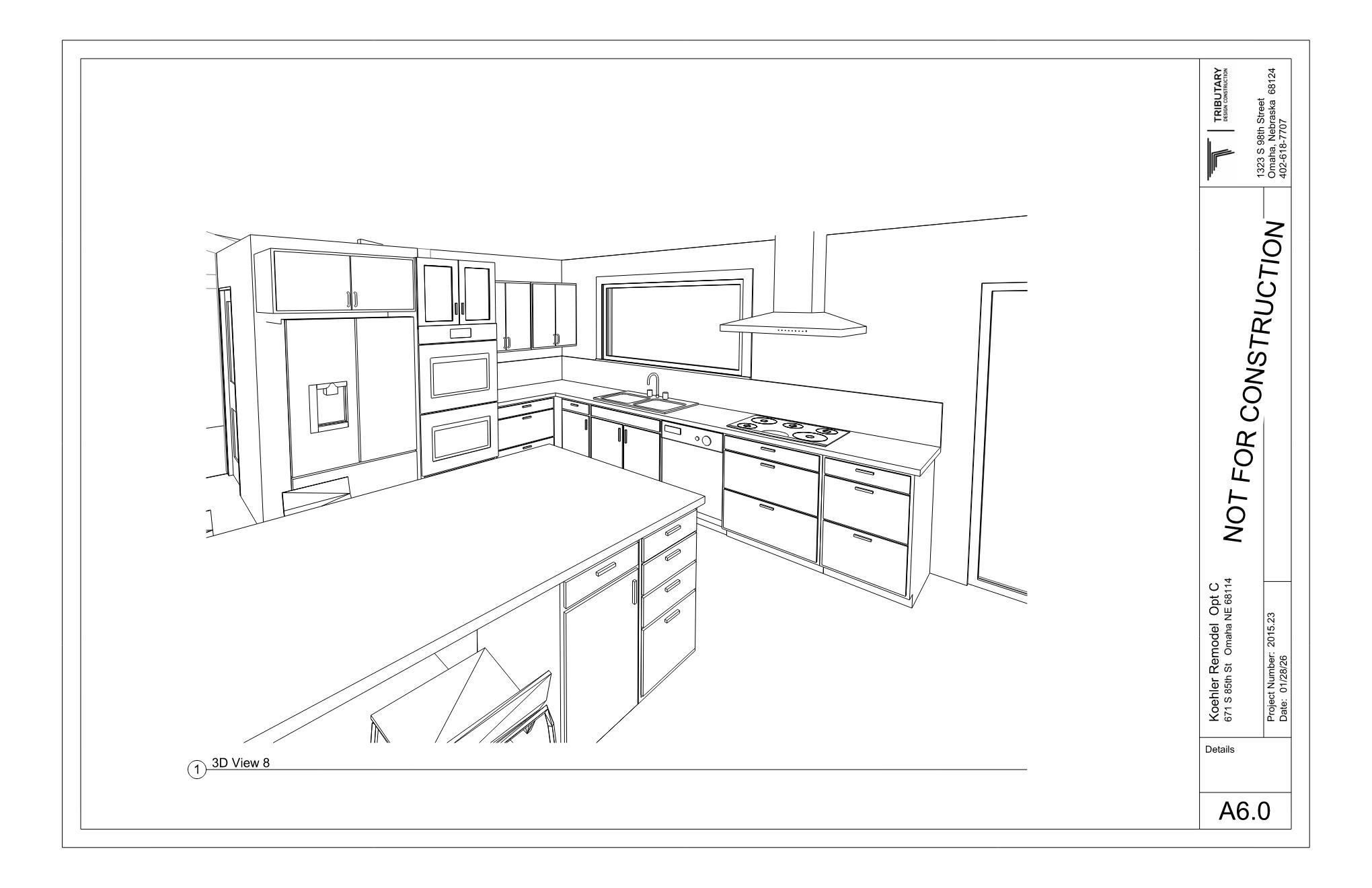 mid century vibe kitchen with sage green cabinets with walnut and brass accents white countertops with matching 12 tall bask splash and stainless steel applinaces leather stools at the island do not change the layout of the kitchen linear light fixture over the island the upper cabinets to the left of the window should be walnut or white