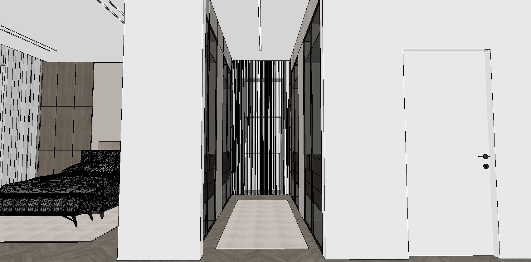 the left side of the render should be the same as the reference photo including the table and the seating and the lights on the ceiling while in the wardrobe section in the middle place led lights inside the closet and put some clothes but don t change anything else so the ambient light should also match the reference photo and should be bright and have a 4000k light