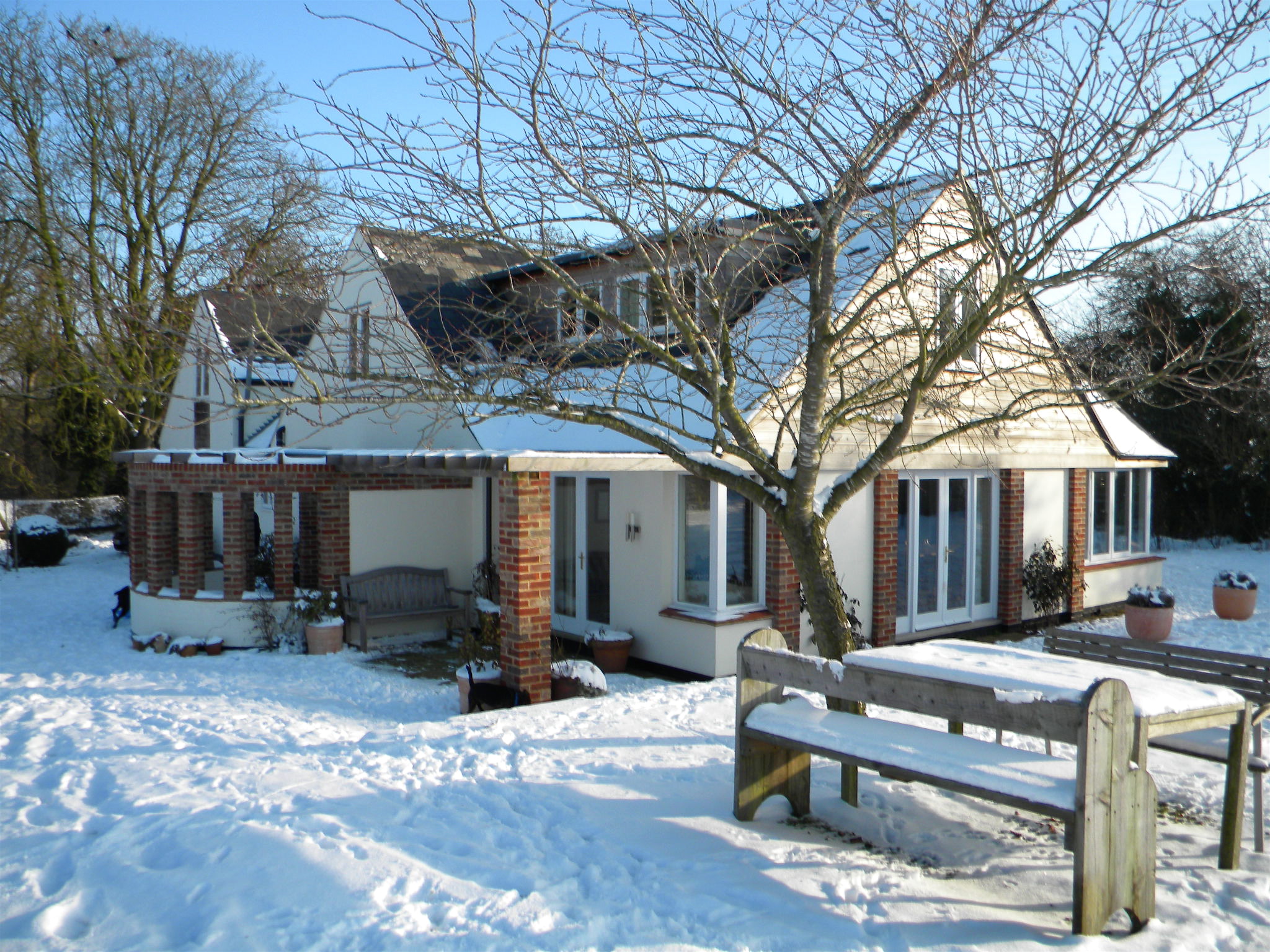 a picturesque modern suburban house with a charming cottage vibe the walls are painted a pristine white contrasting beautifully with a roof of dark slate natural western red cedar horizontal boarded cladding and all window and door frames adds a silvery warmth and character to the structure red brick piers in the foreground a lightly shaded snowy wintery scene