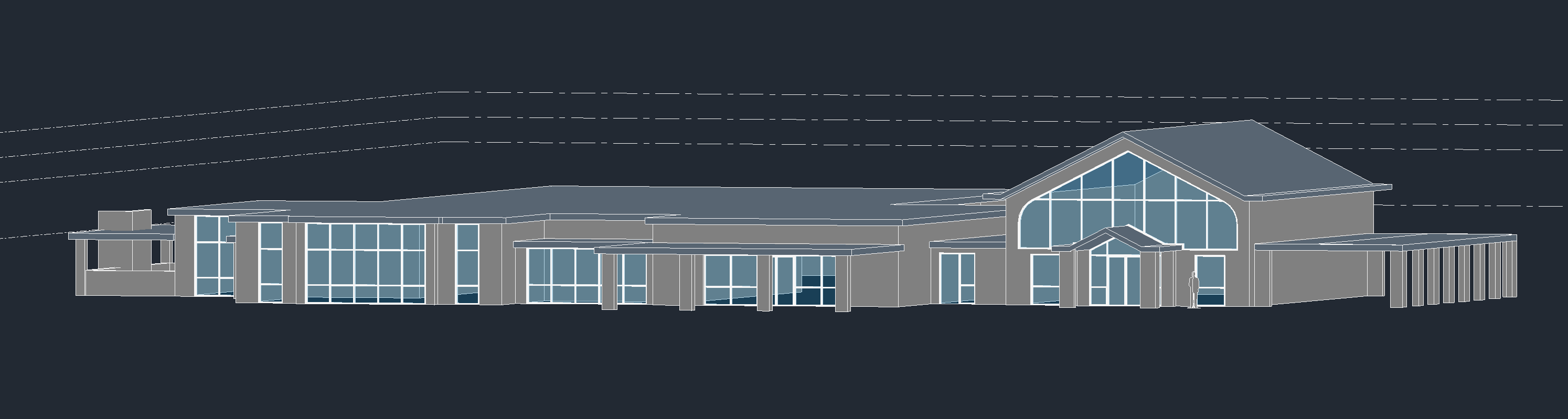 this is a modern funeral home in topeka kansas make the glass reflective make the mullions black make the walls a combination of vertical wood slats limestone and concrete make a driveway to the carports in front and on the right of the building landscaping should be clean cut and native to kansas
