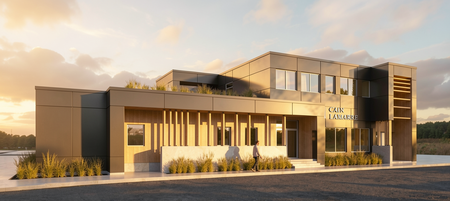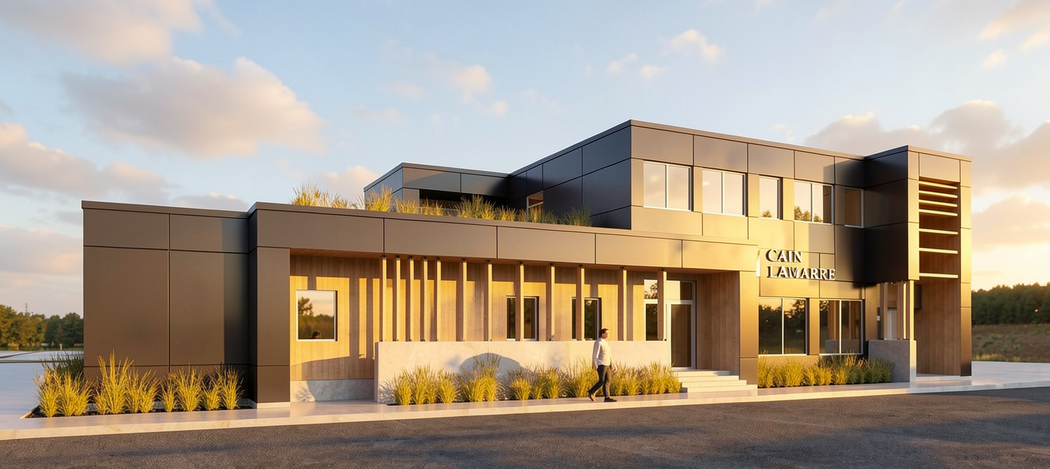 white wash brick with black metal cladding on the right side charcoal shingle roof