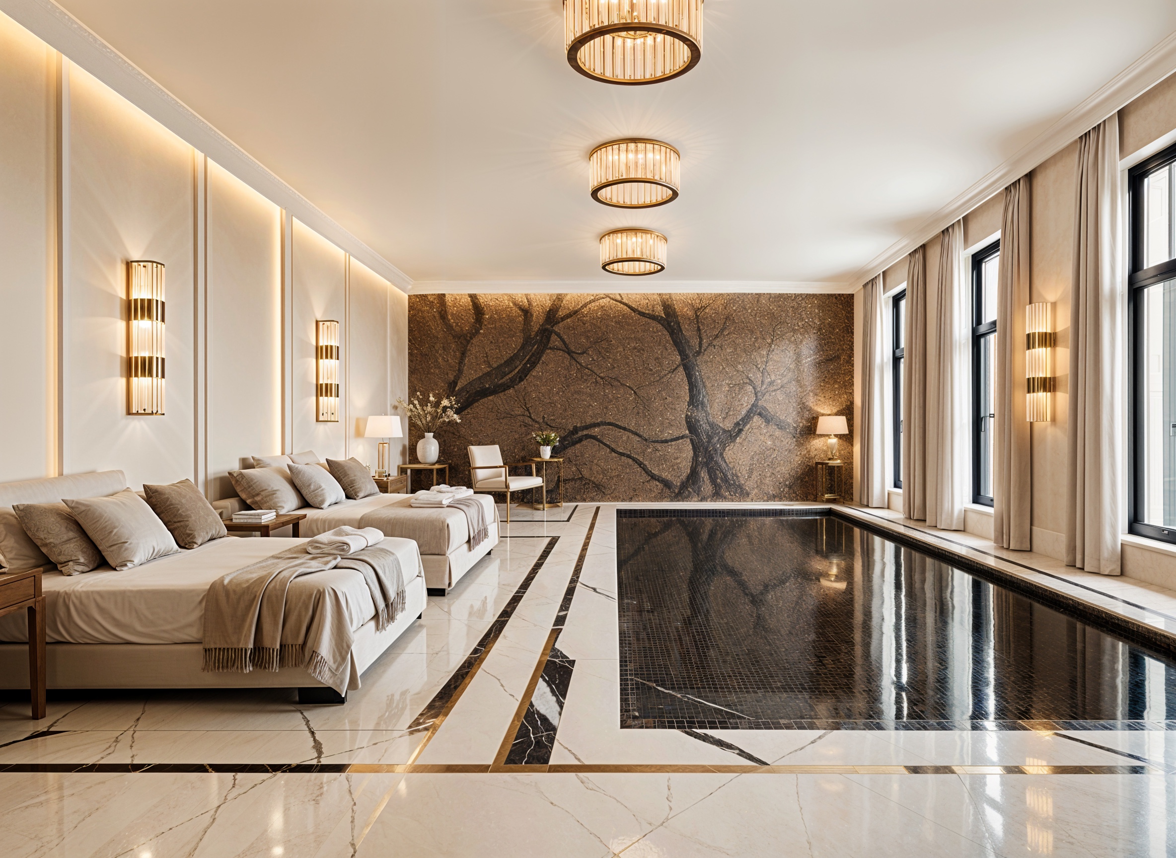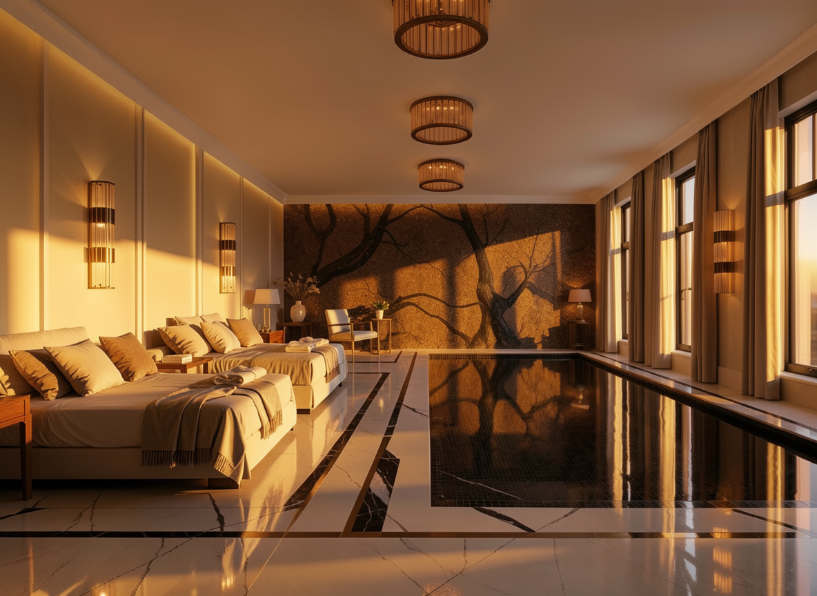 transform this visualization into an evening lighting scenario with intensified atmosphere keep all materials textures and architectural elements exactly as designed emphasize layered artificial lighting ambient ceiling glow accent lights highlighting key architectural details and subtle decorative lights to enhance textures of walnut mineral surfaces and velvet increase shadow play contrasts and reflections to make the space visually rich and immersive the mood should feel luxurious intimate and cinematic highlighting the concept of layered illumination without altering materials colors or geometry