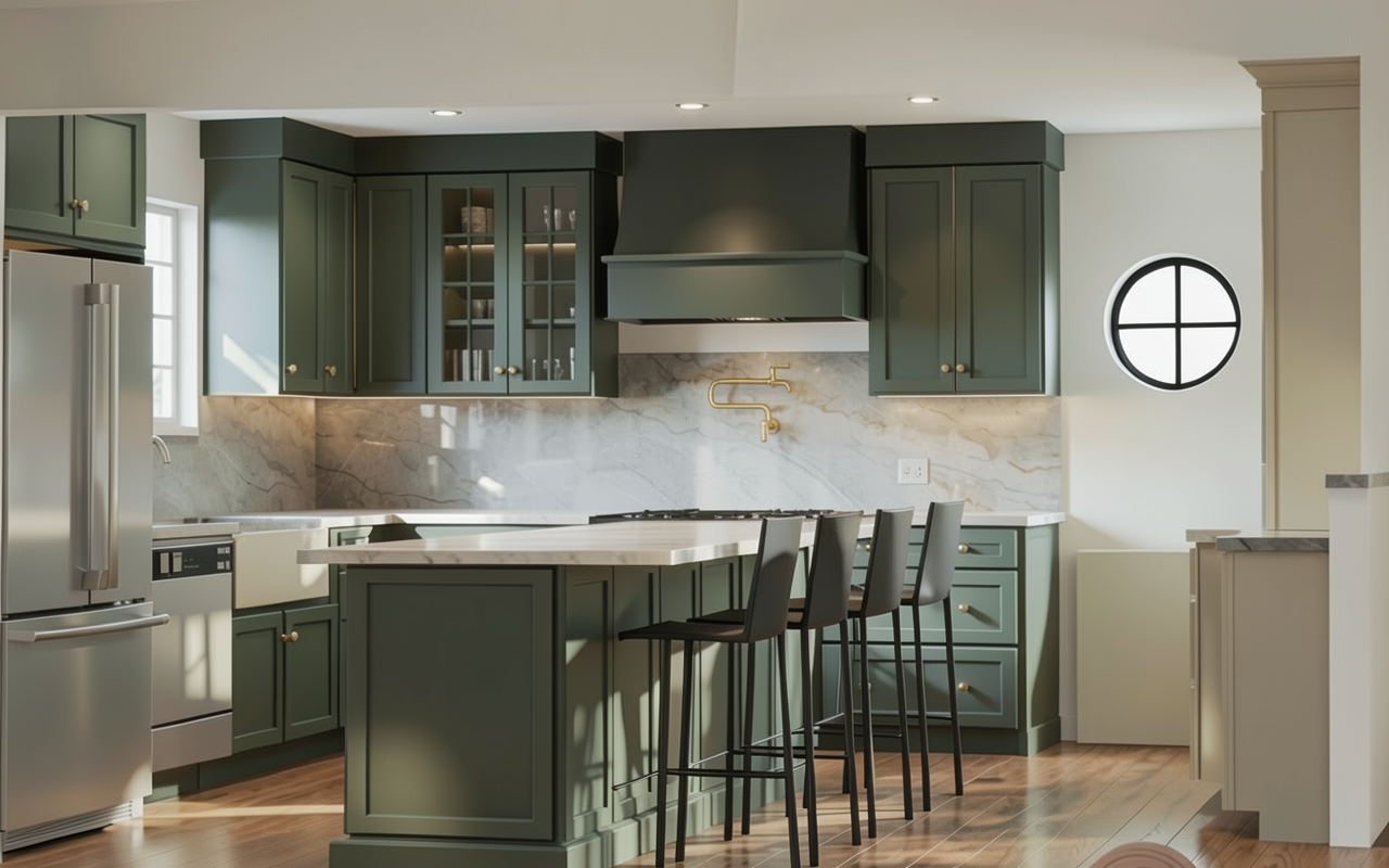 keep everything the same do not change layout or material only add a small ledge were the backsplash stops over the oven render this into a photo realistic rendering
