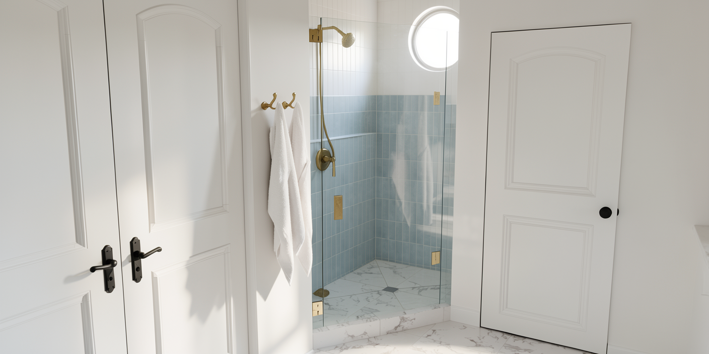 narrow elongated bathroom interior moroccan riad style intricate hand painted blue and terracotta zellige tile floor continuing up the lower walls warm plaster upper walls in aged ivory a skylight with ornate iron grille casting geometric shadow patterns arched niches with candles hammered copper vessel sink on a carved cedar vanity antique brass fittings hanging lantern pendants with pierced metal casting star patterns lush ferns rich textural layering warm ambient glow architectural photography 8k photorealistic render