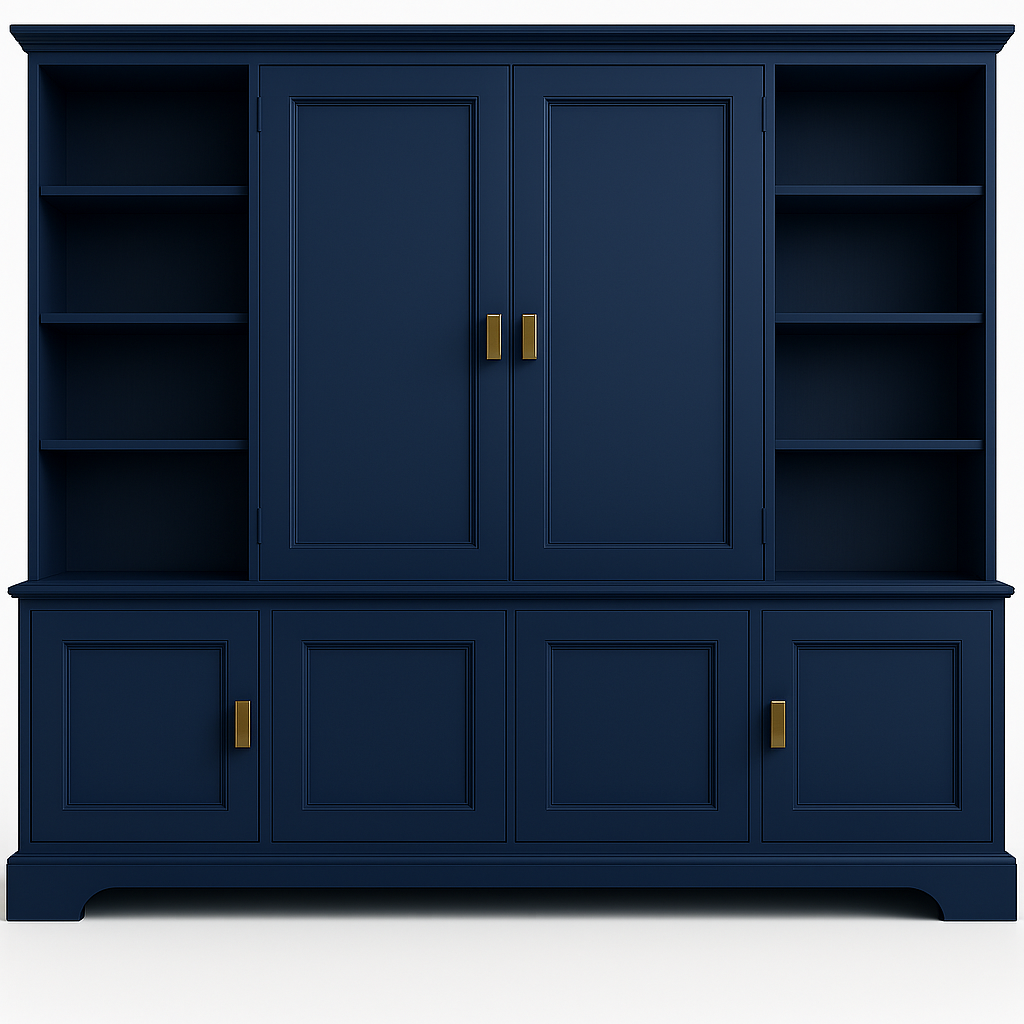 make the image of a living room with a book shelf on each side of the tv stand attached a curved white sofa in front of it and a massive glass folding window on the right hand side include a wood side table