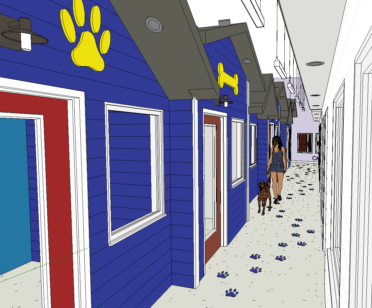 render this make the person in animal shelter attire add an screen display on each window sill for dog profiles white speckled floor with winding dog paw prints