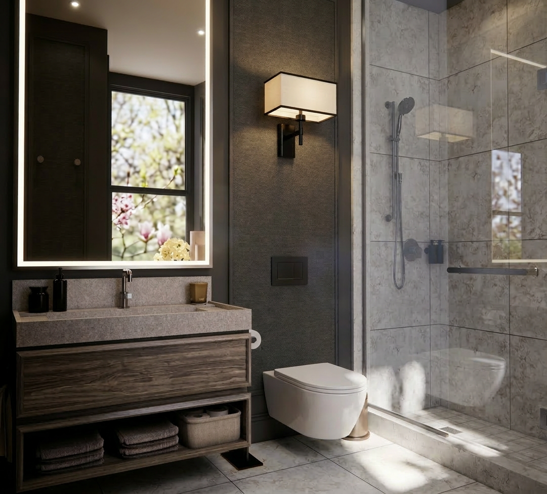 keep everything the same but make change the toilet for a wall mounted model with a black flush make this render look realistic