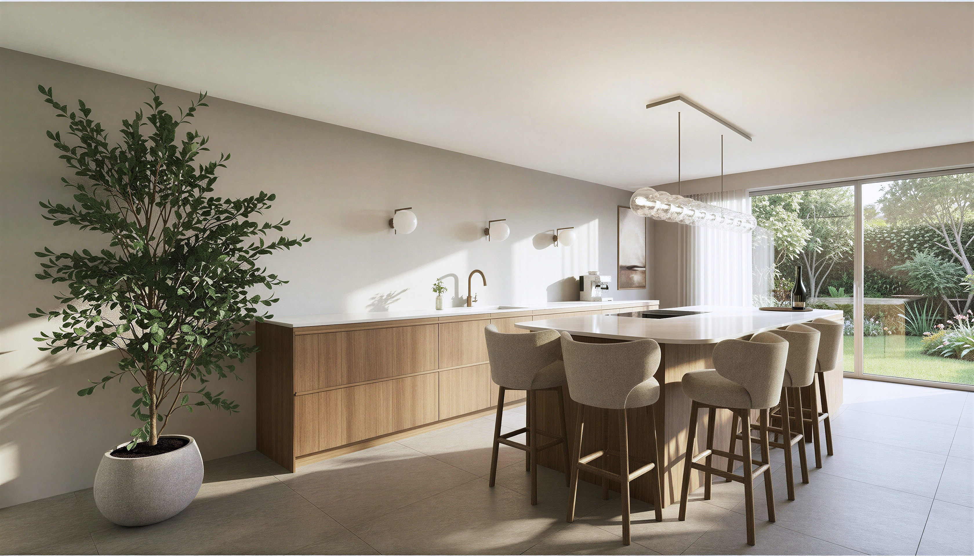 laat alles zoals het is op deze foto je mag enkel het volgende veranderen de drie wandlampen moeten vervangen worden voor een plank tegen de muur met een led lijn er in de plank moet groot genoeg zijn om kopjes en schotels op de zetten de plank moet in dezelfde kleur worden uitgevoerd als de fronten van de keuken rechts van de plank moeten twee minimalistische up and down wandlampen komen die ongeveer 15 cm uit elkaar zitten
