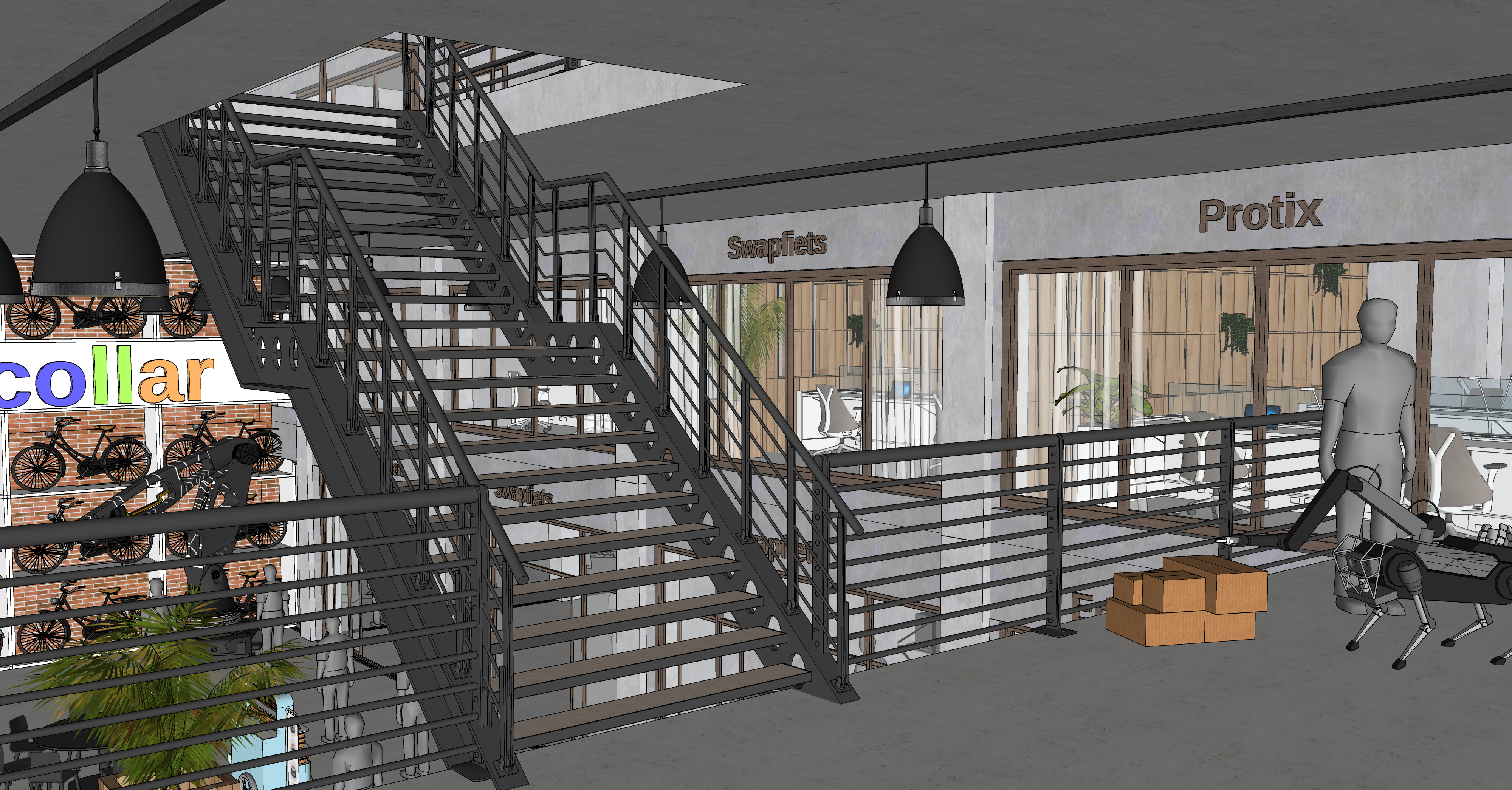 modernist interior shot industrial coworking space robotics wooden details white walls concrete floor light ambience architecture