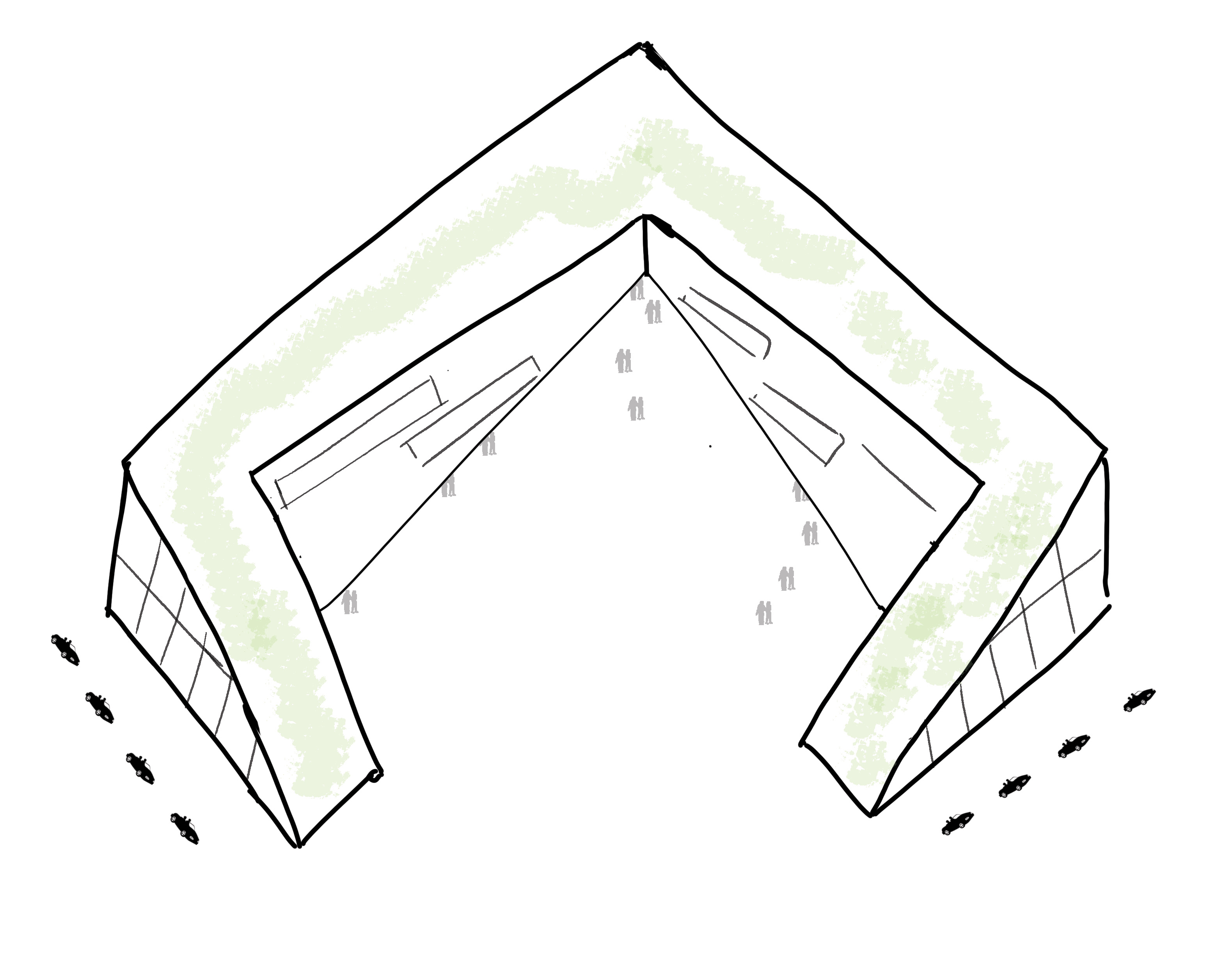 exterior shot use the uploaded concept sketch as strict geometry reference design a contemporary architectural building with a pentagonal plan and one side resting on the ground forming an open courtyard void the mass is a monolithic fair faced concrete volume in tadao ando style smooth concrete precise formwork joints regular tie holes crisp edges the roof is a walkable green roof landscape roof that starts at ground level on both side wings rises continuously along the two arms and meets at the front right angle corner the tip like copenhill emphasize the large triangular undercroft void under the tip a dramatic carved space with deep shadow strong perspective and a refined soffit subtle ribbed concrete or board formed texture minimal openings only thin horizontal slit windows on the inner faces as shown in the sketch very controlled and minimal add a clear public path on the green roof subtle stairs ramps minimal dark metal railings small people silhouettes for scale clean landscaping photorealistic architectural render high detail concrete material realistic grass and planting cinematic composition wide angle lens high resolution