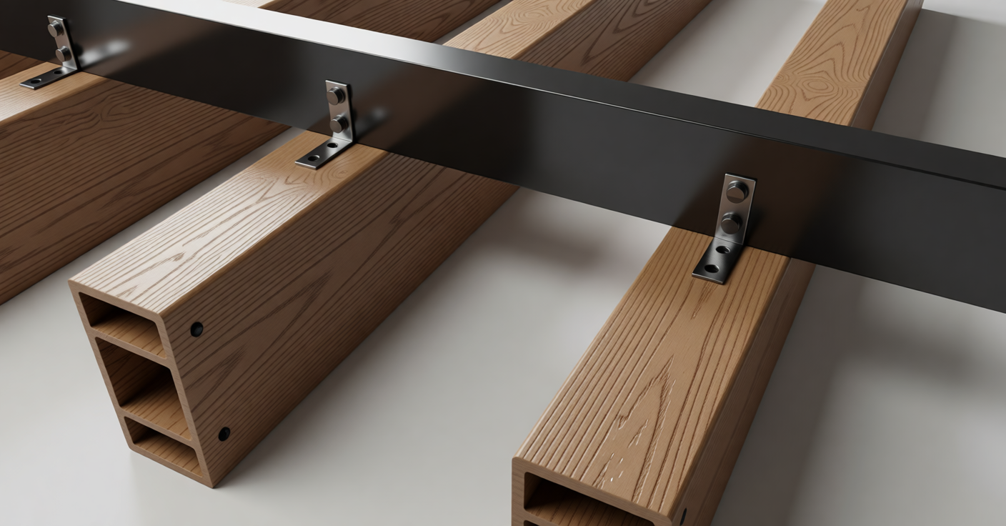 make it more realistic maintain the holes maintain the finish of the new metal joist maintain the colors maintain the finish of the beams that are made of wpc color teak