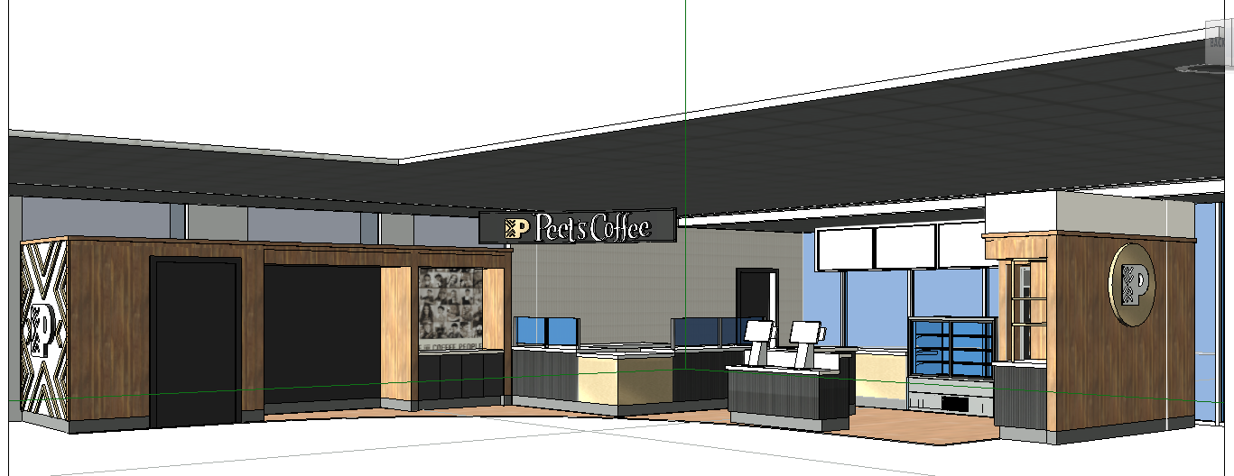 render a modern coffee shop interior with a cozy inviting atmosphere the walls are adorned with warm dark wood accents and illuminated by soft ambient lighting the counters are sleek and contemporary featuring a combination of cream and deep gray tones large windows allow natural light to filter in casting a gentle glow on the polished surfaces a prominent sign peet s coffee is displayed in elegant black and white the overall color palette includes rich browns neutral creams and cool grays creating a harmonious blend that evokes comfort and sophistication