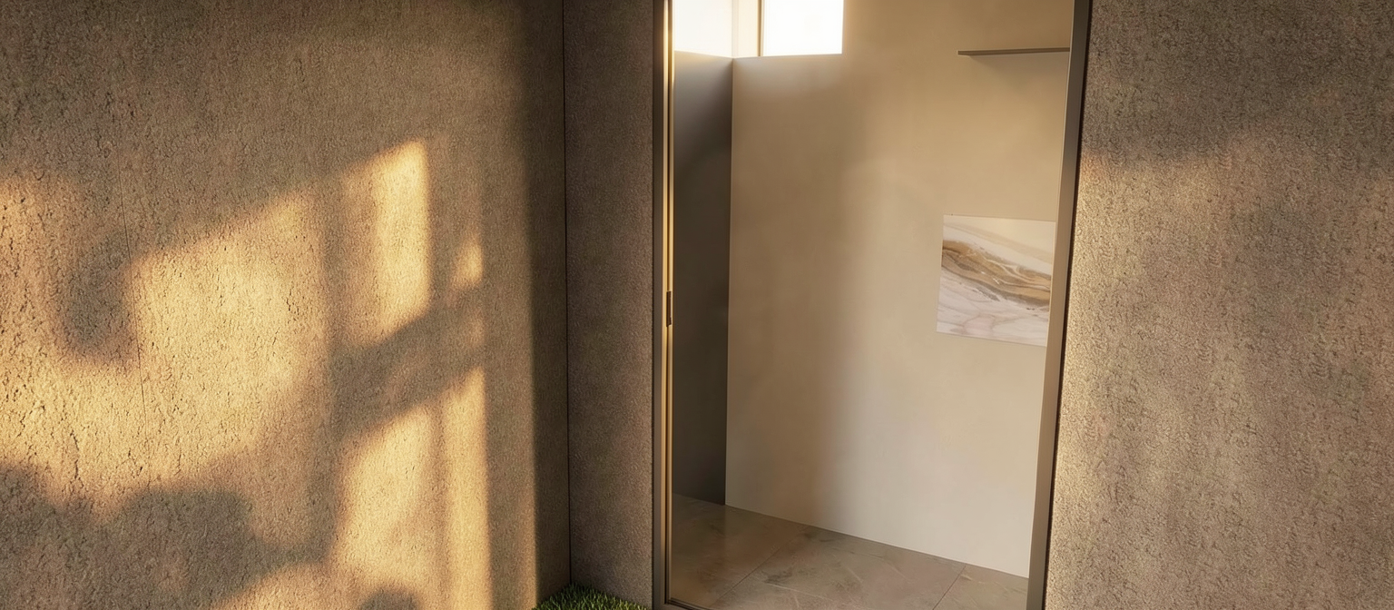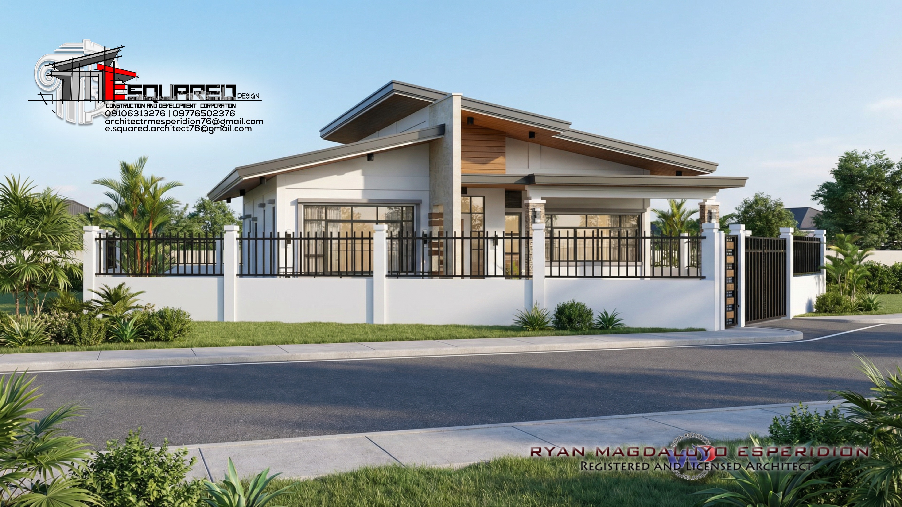 create a cinematic architectural presentation video using the provided image of a modern single storey residence start with a slow aerial dolly in shot from street level revealing the full frontage of the house emphasize the clean modern lines sloped roof design wide glass windows and elegant perimeter fence transition into a smooth left to right tracking shot along the fence highlighting the landscaped garden tropical plants and premium exterior finishes add a subtle sun flare and warm afternoon lighting creating a calm luxurious atmosphere shadows should move naturally across the fa ade to show depth and realism include a gentle push in toward the main entrance focusing on the architectural details such as wood accents concrete textures and metal railings the environment should feel peaceful upscale and tropical with soft breeze movement on plants and trees camera motion must be stable slow and cinematic suitable for a professional real estate and architectural client presentation end with a wide hero shot of the house perfectly centered showcasing the full design as a completed premium residential project ultra realistic 4k quality architectural visualization style natural colors no distortion