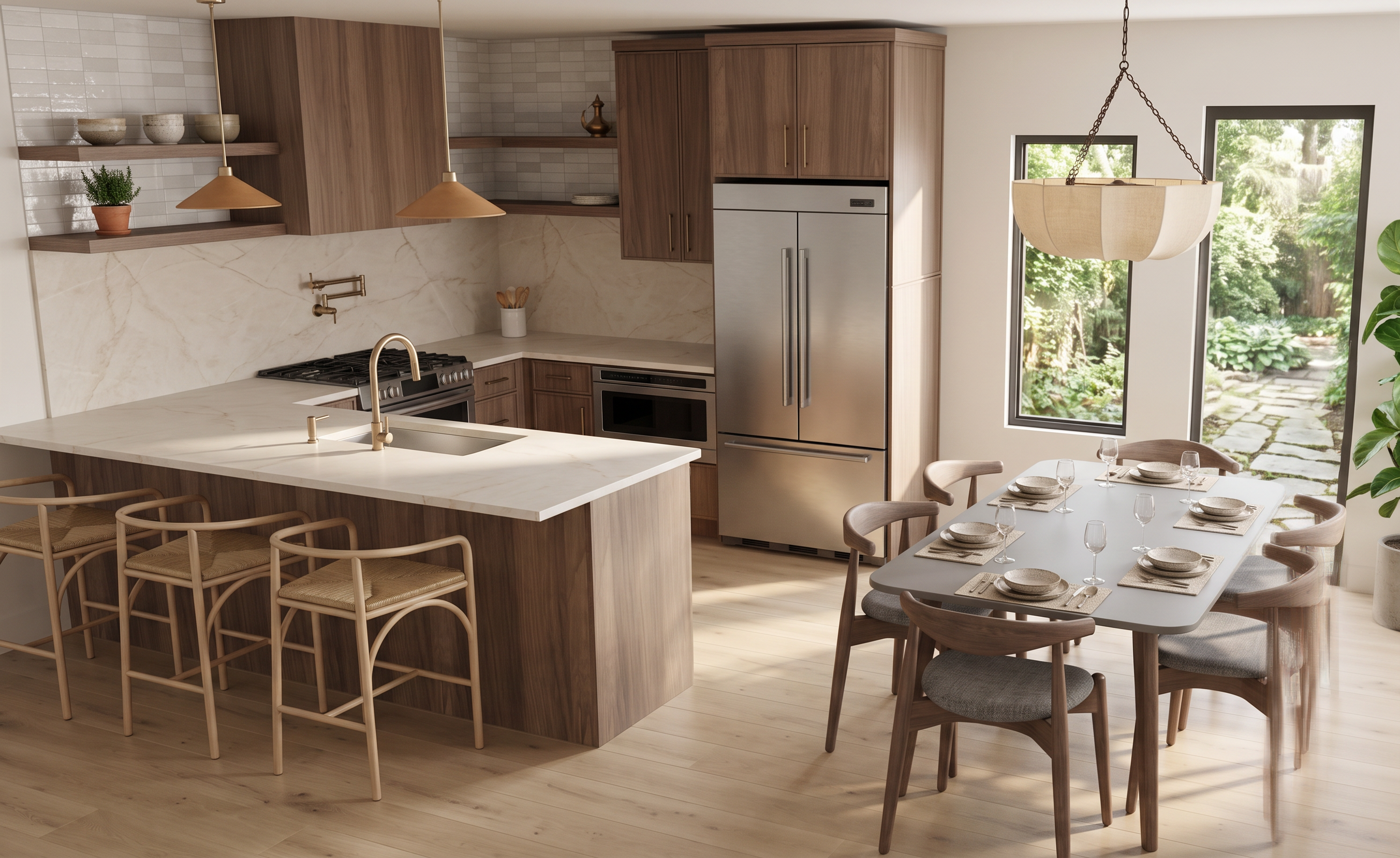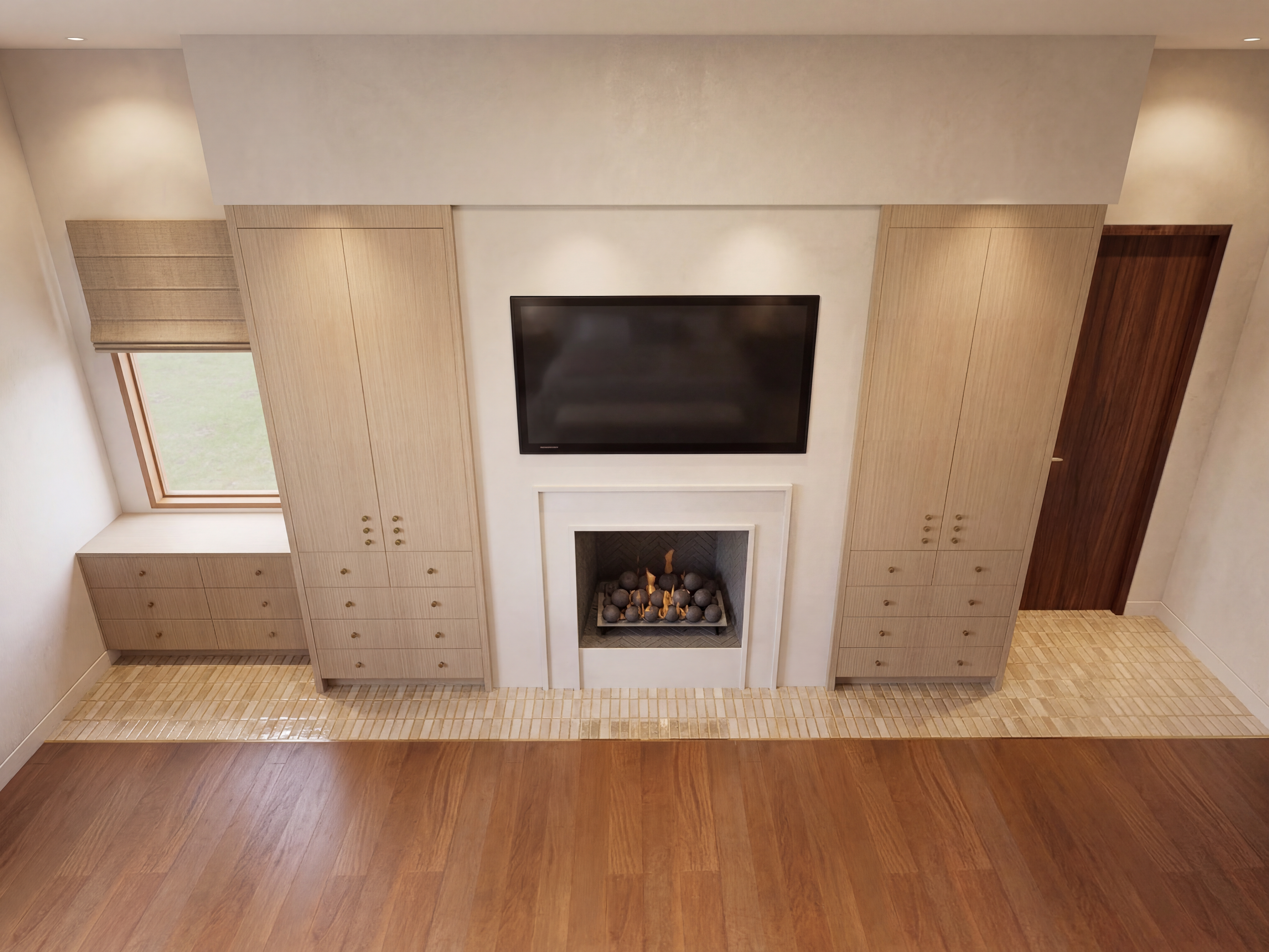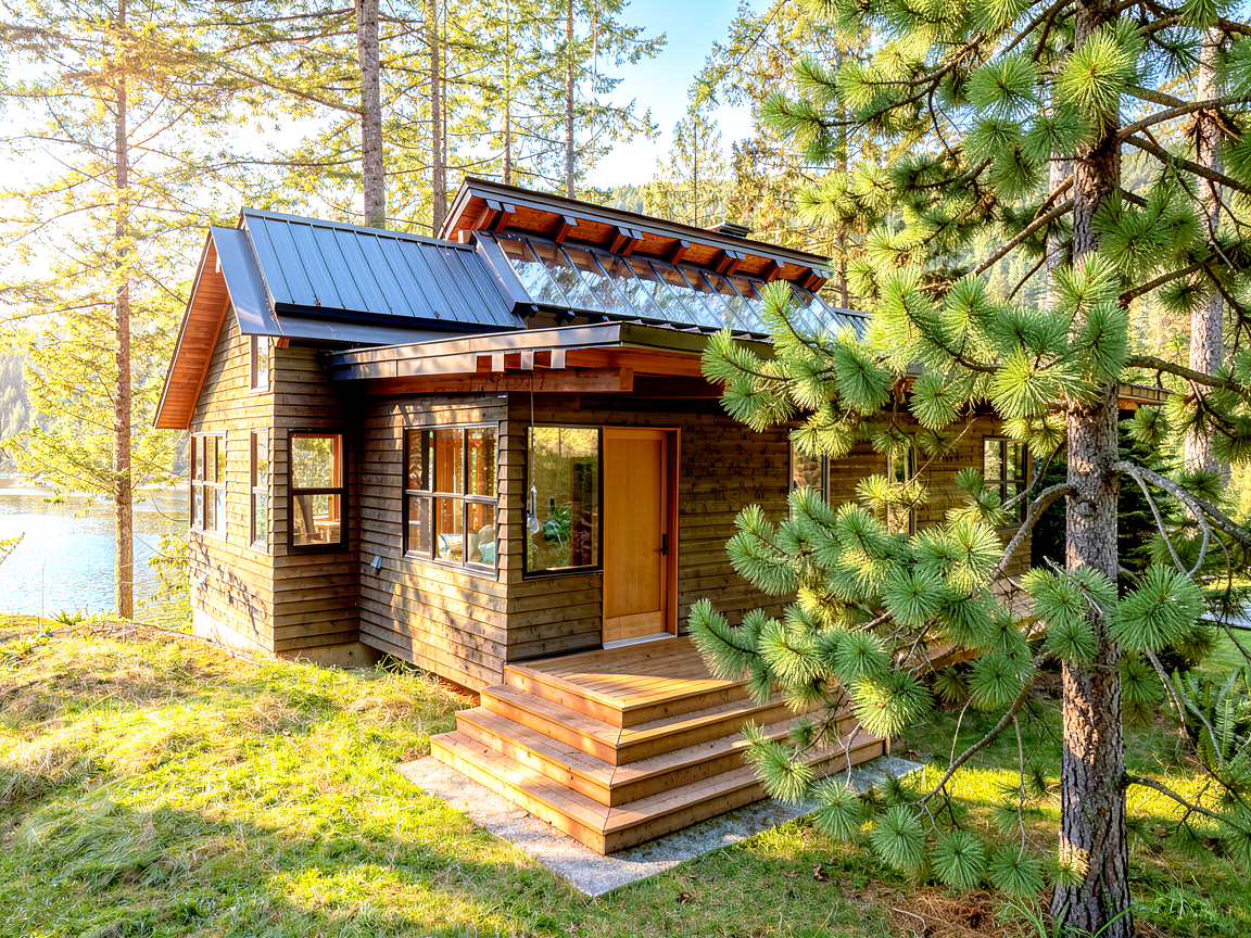 add pine tree to right side of photo partially in front of building show door opened inwards