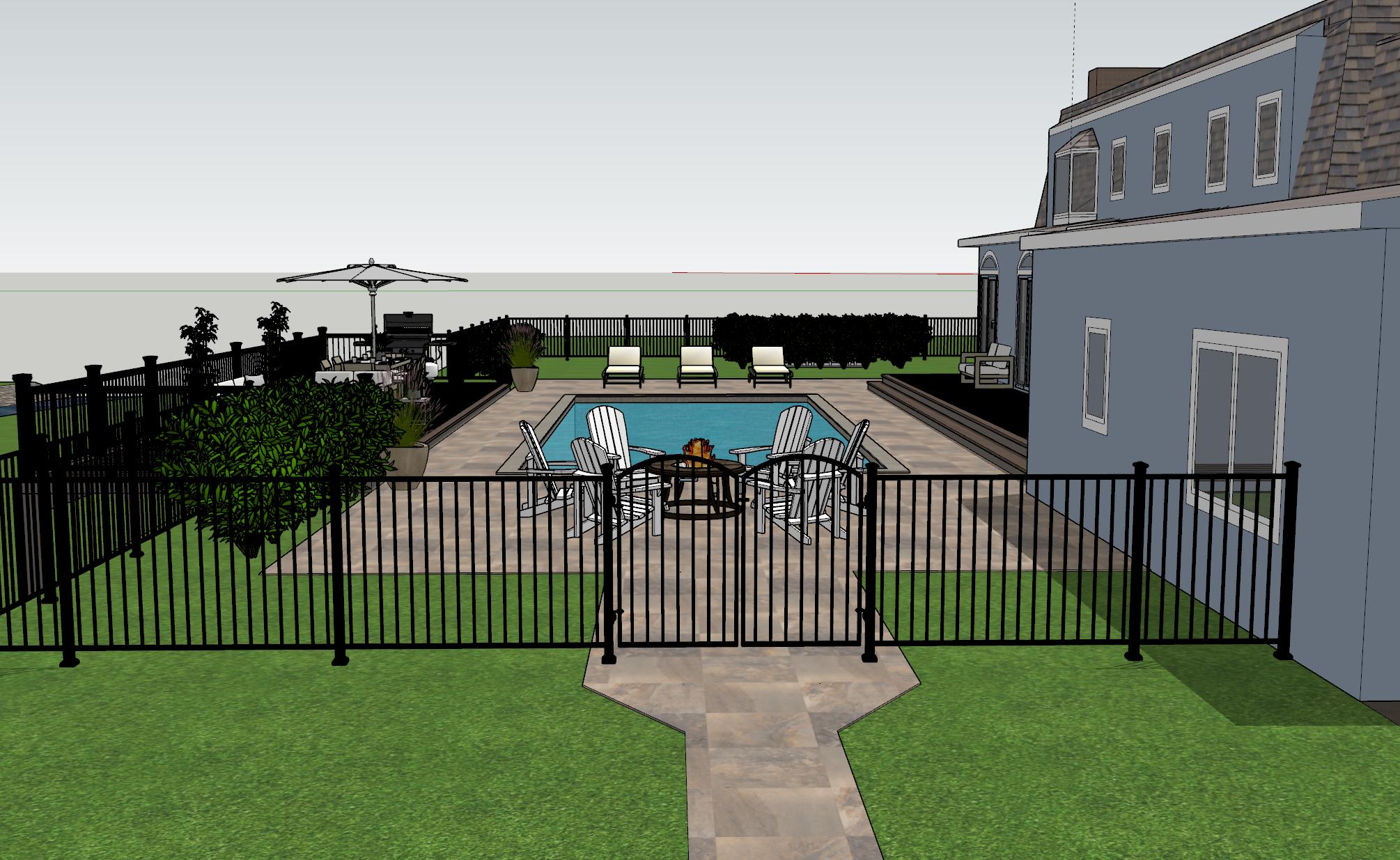 lush tree background double rounded black gate on both ends paver patio brick chimney