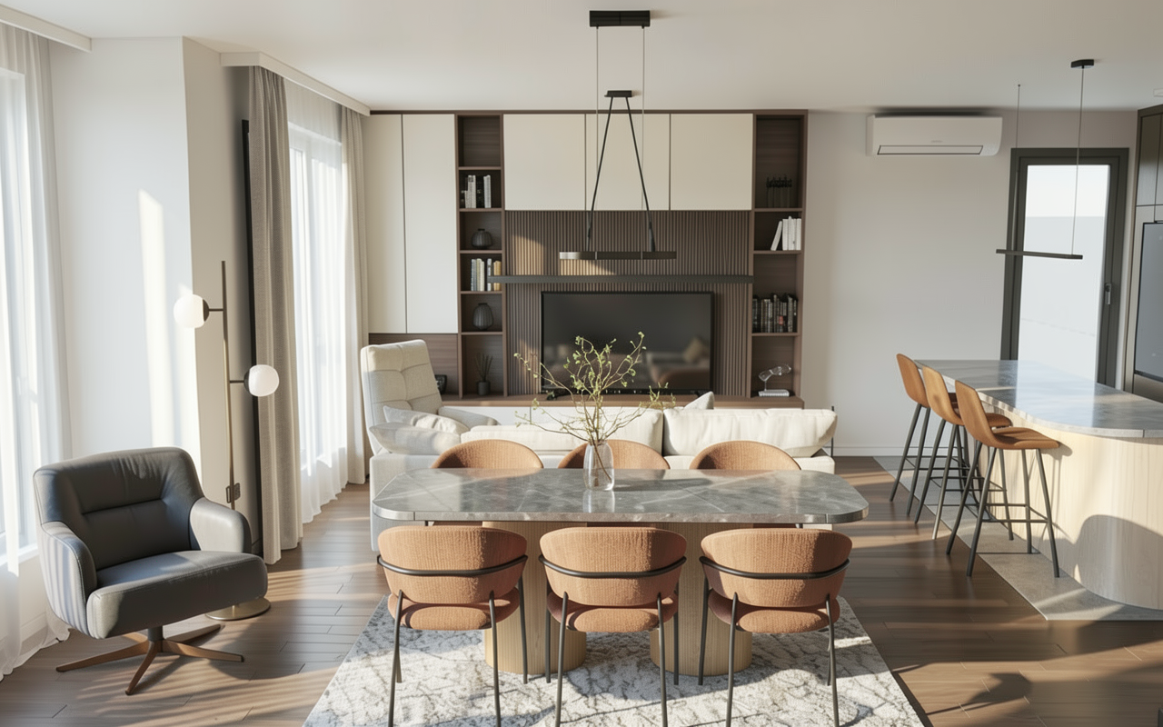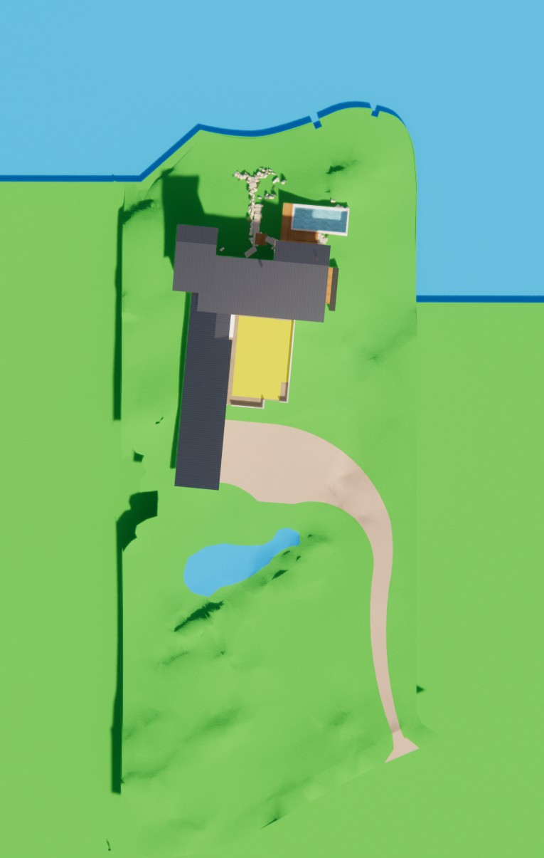 create a photorealistic birds eye view site plan rendering top down high oblique drone view choose whichever matches the reference match the reference image exactly do not alter any geometry green areas are natural native land yellow areas grass lawn mown healthy slightly sun faded late summer tone brown areas brown gravel driveway angular gravel texture realistic compaction subtle tire patterning if shown smaller blue shape natural pond irregular natural edges shallow to deeper gradient natural coloration bigger blue shape at top of image is the lake context location contemporary lakehouse on inks lake texas hill country keep all site geometry and relationships identical to the reference shoreline bulkhead line dock walkway tie in boathouse position house position and any terraces paths shoreline water match reference lake occupies the portion of the frame consistent with the reference plan view water body shape must match exactly calm blue green water at normal level with gentle wind ripples and realistic reflections where visible from above shoreline has a concrete bulkhead with low native grasses immediately above it retain exact bulkhead geometry and alignment architecture do not alter retain the exact structure from the reference window arrangement rooflines foundation height proportions two story portion is a screen porch keep its openness and scale exactly as shown materials white stucco siding light gray standing seam metal roofing exposed timber rafter tails accurate glazing with realistic reflections no warped fenestration dock boathouse boat include a boathouse connected to the shore via a dock walkway tied into the bulkhead exact placement per reference place one boat in the water near the boathouse floating naturally with minimal disturbance small ripples consistent with calm conditions keep relative position consistent with the reference topography planting use reference topo lines use the topo lines from the reference to build an accurate site behind the bulkhead no smoothing no reinterpretation minimal site disturbance native drought tolerant hill country landscaping and natural pathways planting scattered live oaks ashe juniper dry golden grasses with occasional green pockets prickly pear accents only where consistent with the reference lighting atmosphere render quality lighting late summer afternoon sun position top left shadows cast bottom right physically accurate direction intensity subtle atmospheric depth warm haze over distant low hills if visible hyper real architectural visualization high micro texture detail stucco metal seams wood grain concrete bulkhead gravel balanced hdr crisp edges crisp shadows vibrant clear sky if included output 8k photoreal render plan site emphasis no diagram styling not flat vector realistic materials and light