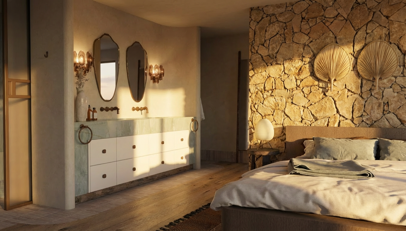 the wall sconces are soft brown toned murano glass the vanity cabinetry is white polyurethane which a reclaimed timber kickboard golden hour dusk time of day the bathroom door is flemished glass with a bronze frame