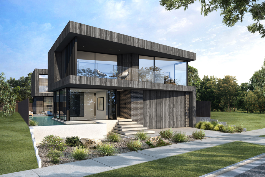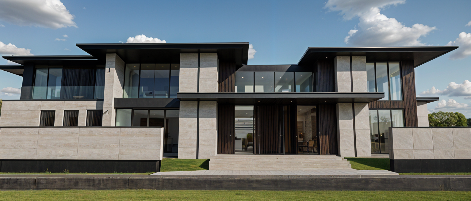 modern architectural house with a sleek minimalist design the facade is adorned with dark wood panels and large glass windows reflecting the sunlight the surrounding landscape is lush and green with the lawn in a vibrant grass green the sky is clear with soft clouds creating a serene and peaceful atmosphere the pathway is light gray concrete leading to the entrance adorned with minimalist shrubbery in shades of green and hints of earthy brown the overall mood is tranquil and elegant with a touch of modern sophistication