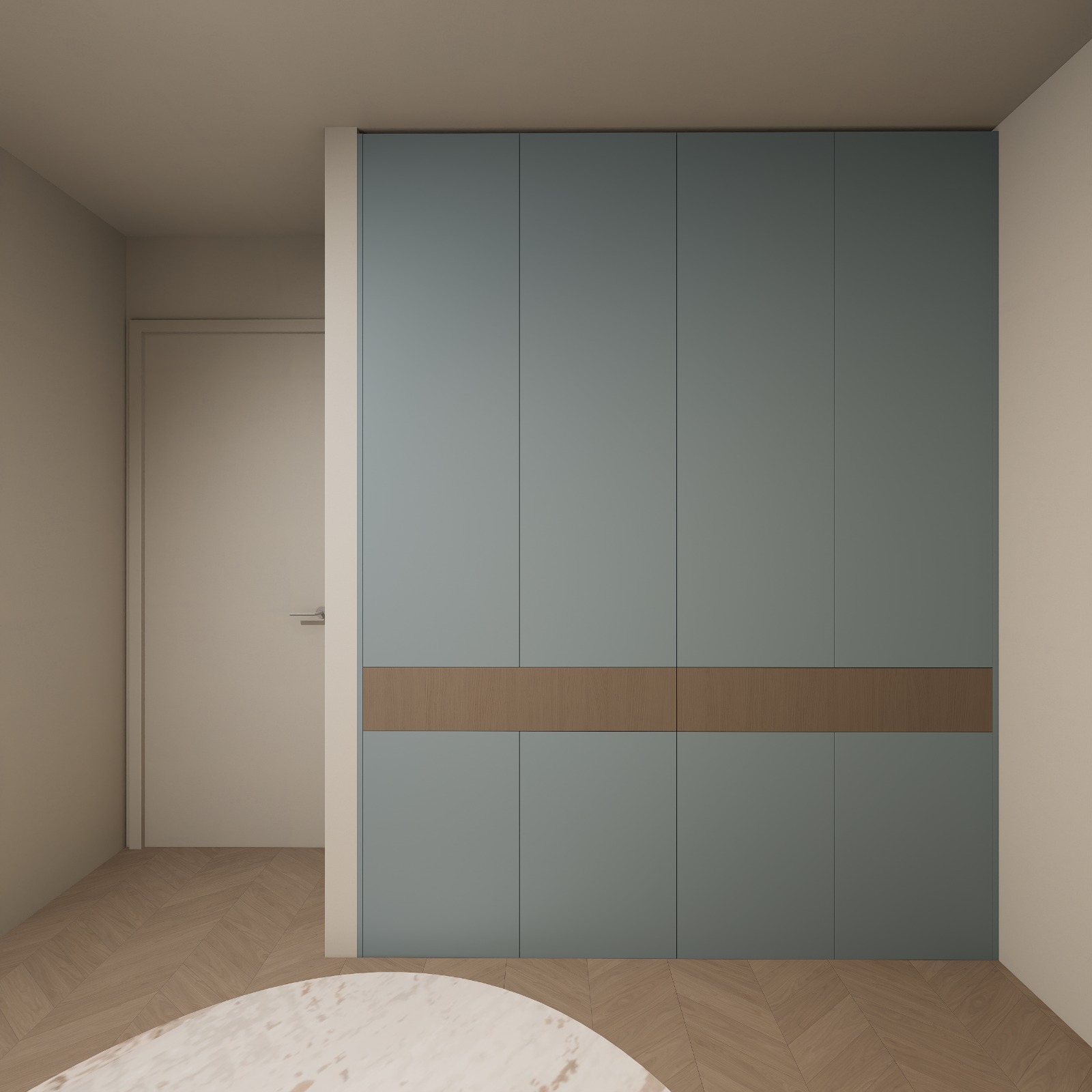 transform this render into an ultra realistic high end built in wardrobe visualization while keeping the exact same layout proportions panel divisions wood accent band position surrounding walls floor pattern ceiling door location and camera angle unchanged do not redesign anything keep the wardrobe in the same muted dusty blue desaturated blue grey matte finish exactly as shown the finish should be smooth matte lacquer soft elegant and uniform with subtle realistic light interaction keep the horizontal middle accent in natural warm oak veneer with fine grain soft tonal variation and a premium matte finish material direction wardrobe panels dusty blue grey matte lacquer middle horizontal band natural oak veneer floor light oak herringbone matte finish walls and ceiling soft warm off white light beige matte paint rug light neutral tone subtle texture enhance realism with soft reflections on the matte lacquer panels refined oak grain on the accent strip realistic panel joints and clean shadow gaps natural wood grain variation on the floor soft ambient occlusion around edges corners and panel lines subtle daylight balance with gentle interior ambient light lighting should feel soft calm and architectural around 3000k 3500k with balanced illumination and realistic shadow falloff keep the image clean bright and premium like a real photographed finished interior render as a photorealistic architectural interior image ultra detailed materials realistic matte finishes refined joinery and a calm luxury aesthetic negative prompt do not change the design do not change panel layout do not move the oak strip do not change camera angle do not change proportions no glossy finish no color shift from dusty blue grey no dark wood no clutter no redesign no distortion no unrealistic lighting no low quality textures