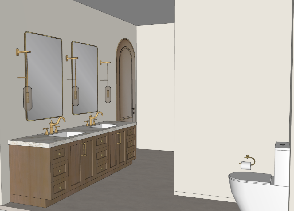 render this bathroom as a photorealistic interior do not change any colors materials finishes proportions or design elements keep the warm medium wood vanity exactly as shown the brass faucets and hardware the white undermount sinks the marble countertop with soft grey veining the warm neutral wall color the beige floor tile and the brass framed mirrors with matching wall sconces maintain the exact layout geometry spacing and camera angle add soft even ambient lighting with subtle directional light from above to enhance realism shadows only improve material depth reflections shadows and natural texture detail while keeping everything else completely unchanged