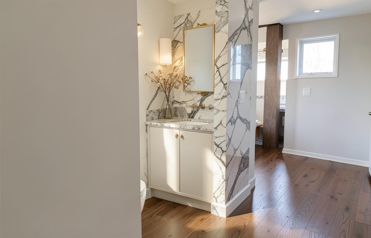 change to one window wall on the right and add green zellige tile change floor on right to same green zellige tile as well change wall sconce and ceiling flush mount to something from in common with lighting change door to no moulding simple pocket door