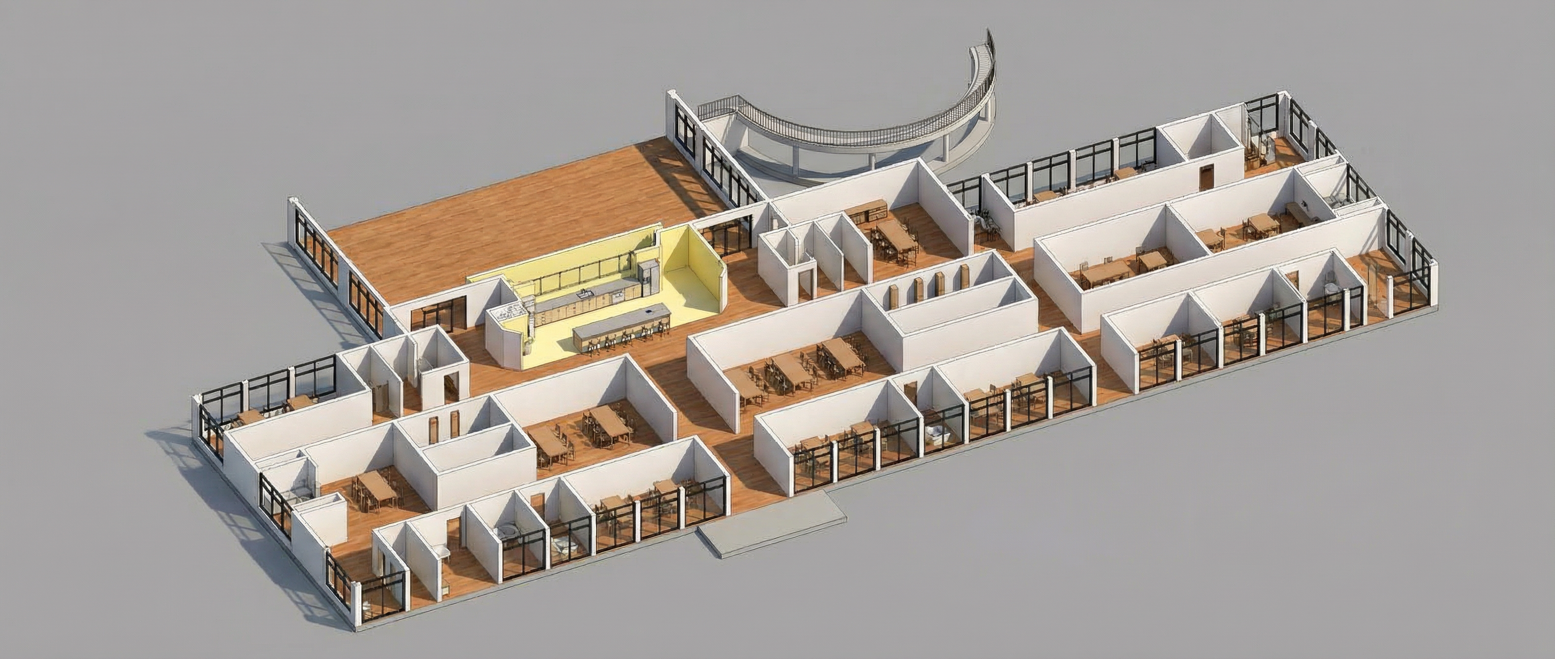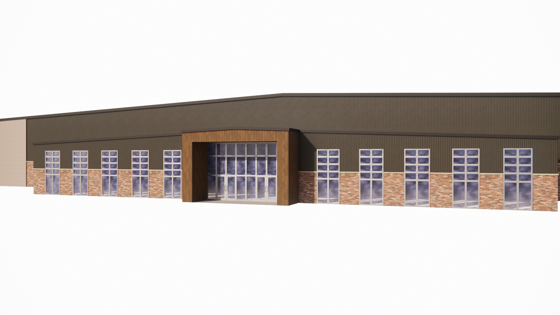 hyper realistic rendering with a city setting don t change anything about the building and don t add windows but wooded background with trees and shrubbery surrounding the building show a big parking lot in front of the building with cars and trucks in the lot show families walking in and out of the full glass entrance with hockey gear
