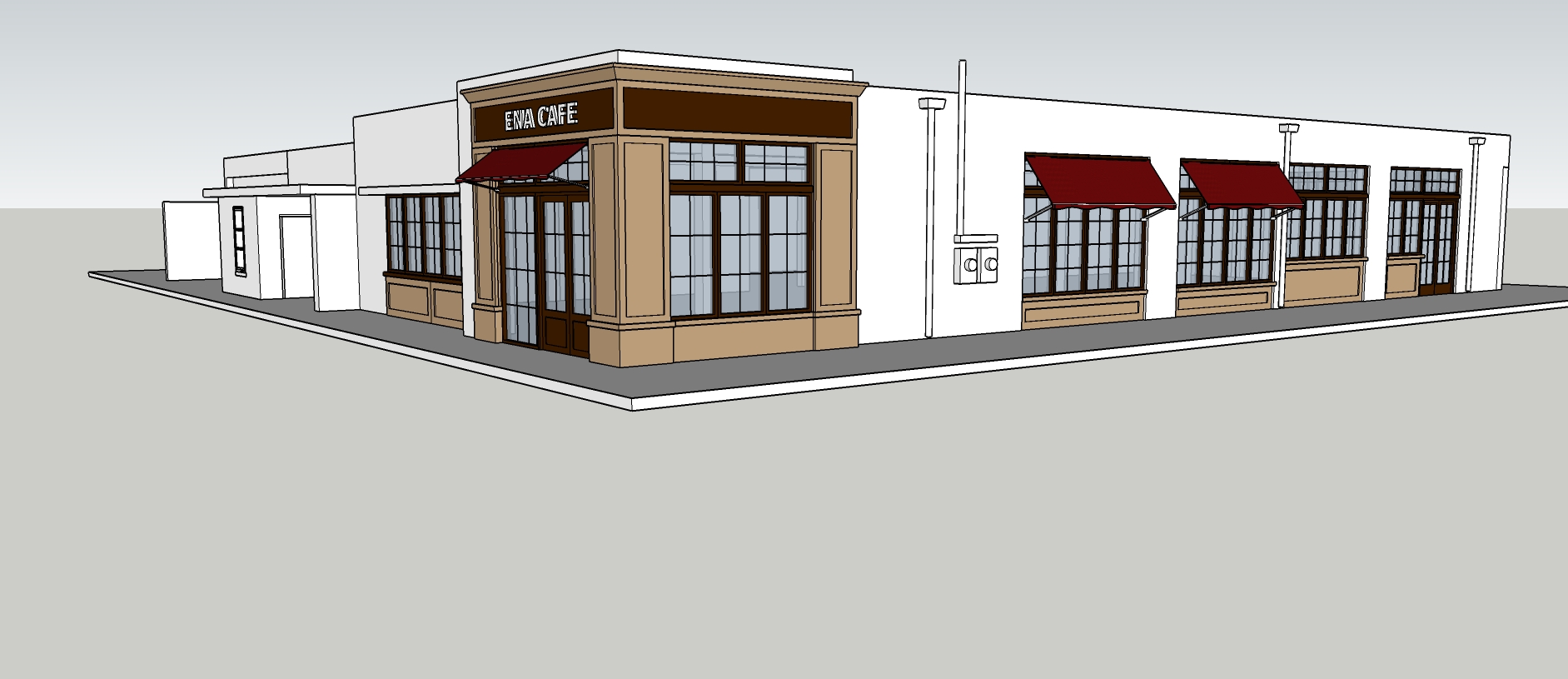 morning lighting european vibe pastry and coffee bar add potted plants outside bistro tables weathered building south florida add people enjoying coffee seated with pastries