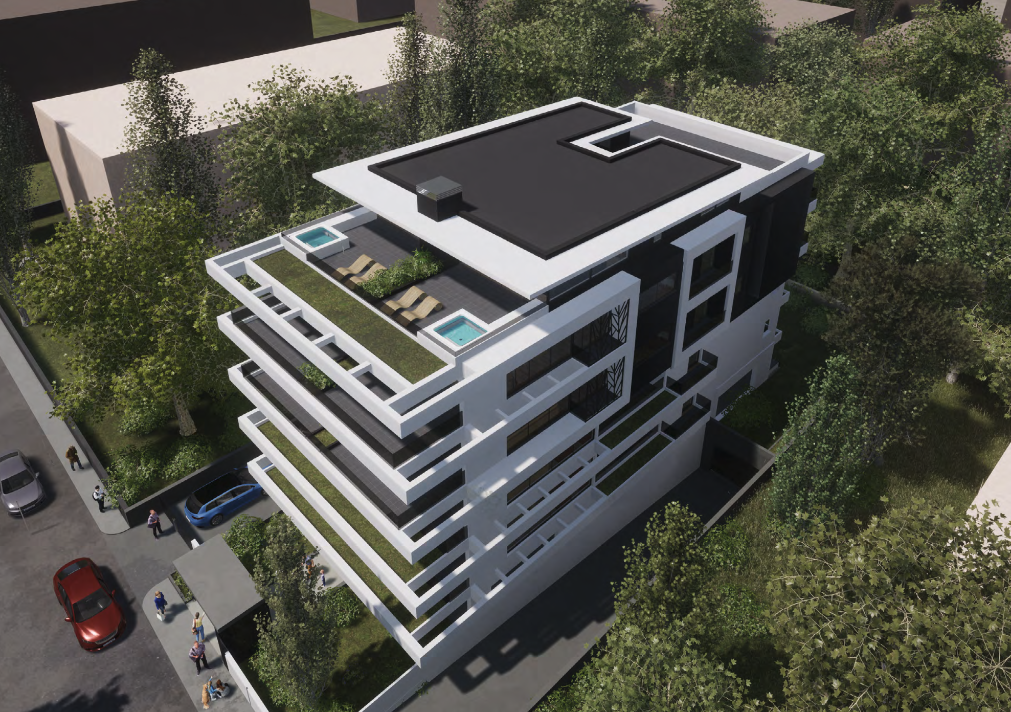 it is a photorealistic of a modern building through the window we can see the interior add a couple of people at the last balcony and some plants at the green area of each balcony