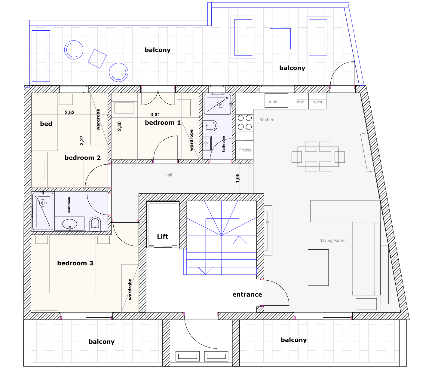 convert this floor plan into a realistic isometric 3d view of a full house show the space from an elevated angle with furniture walls and details visible minimal light colours beige and wood use the same furniture as shows on the plan do not change the orientation of the floorplan