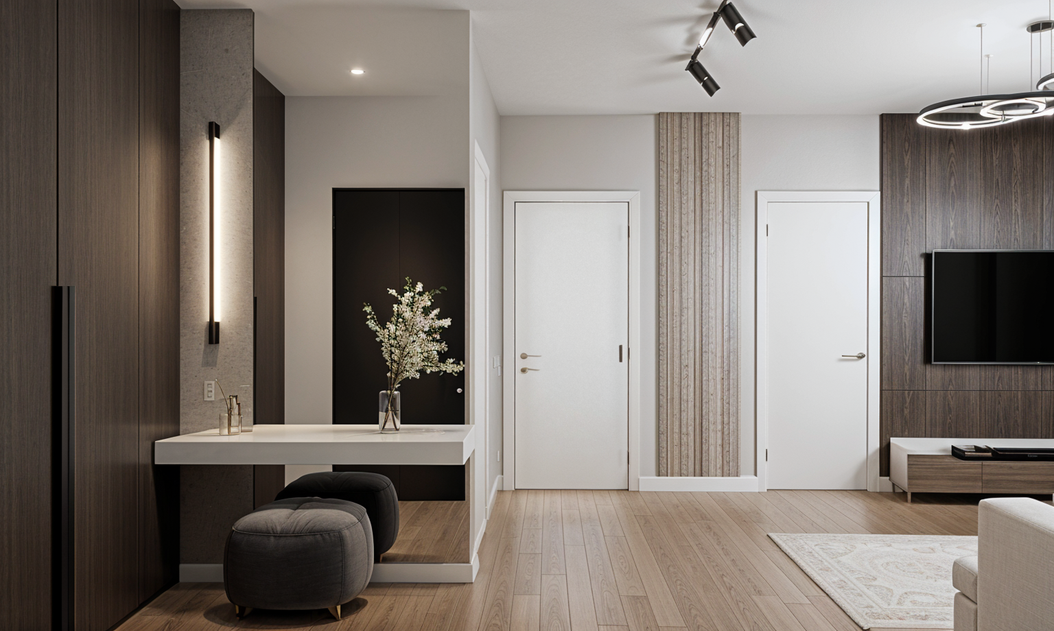 render a premium md office with a white based background and a clean modern aesthetic the left side wall must be a full frosted glass partition allowing soft diffused light while maintaining privacy the back wall should feature a subtle vastu friendly ganesha art placed on a clean white wall design the md table to be more attractive luxurious and eye catching preferably a modern executive table with elegant lines premium materials and a statement look make the md chair and visitor chairs highly attractive ergonomic and stylish using a contemporary high end design apply soft indirect lighting to enhance the sophisticated corporate ambience architecture