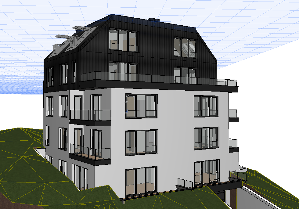 render a modern four story building with a black gabled metal roof and white facade the window frames and balconies are sleek black adding contrast the lush green grass surrounds the building enhancing its contemporary design the atmosphere is clear and bright giving the scene a vibrant and welcoming appearance with a hint of sunlit warmth reflecting off the surfaces