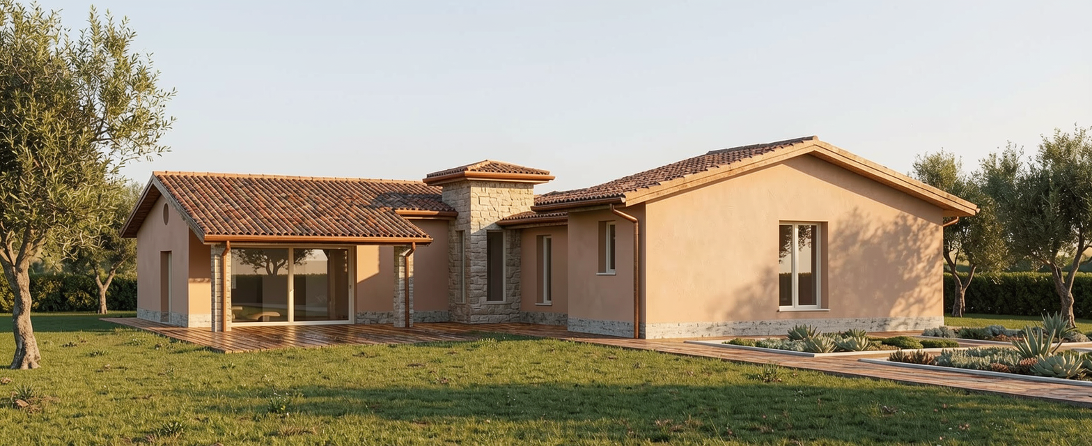 add rock slab patio at ground level rock stairs coming down from house patio wrap the patio around the side of the house this house in in montana make wood siding ghost wood like jackson hole house make golden hour outside with light coming from inside house
