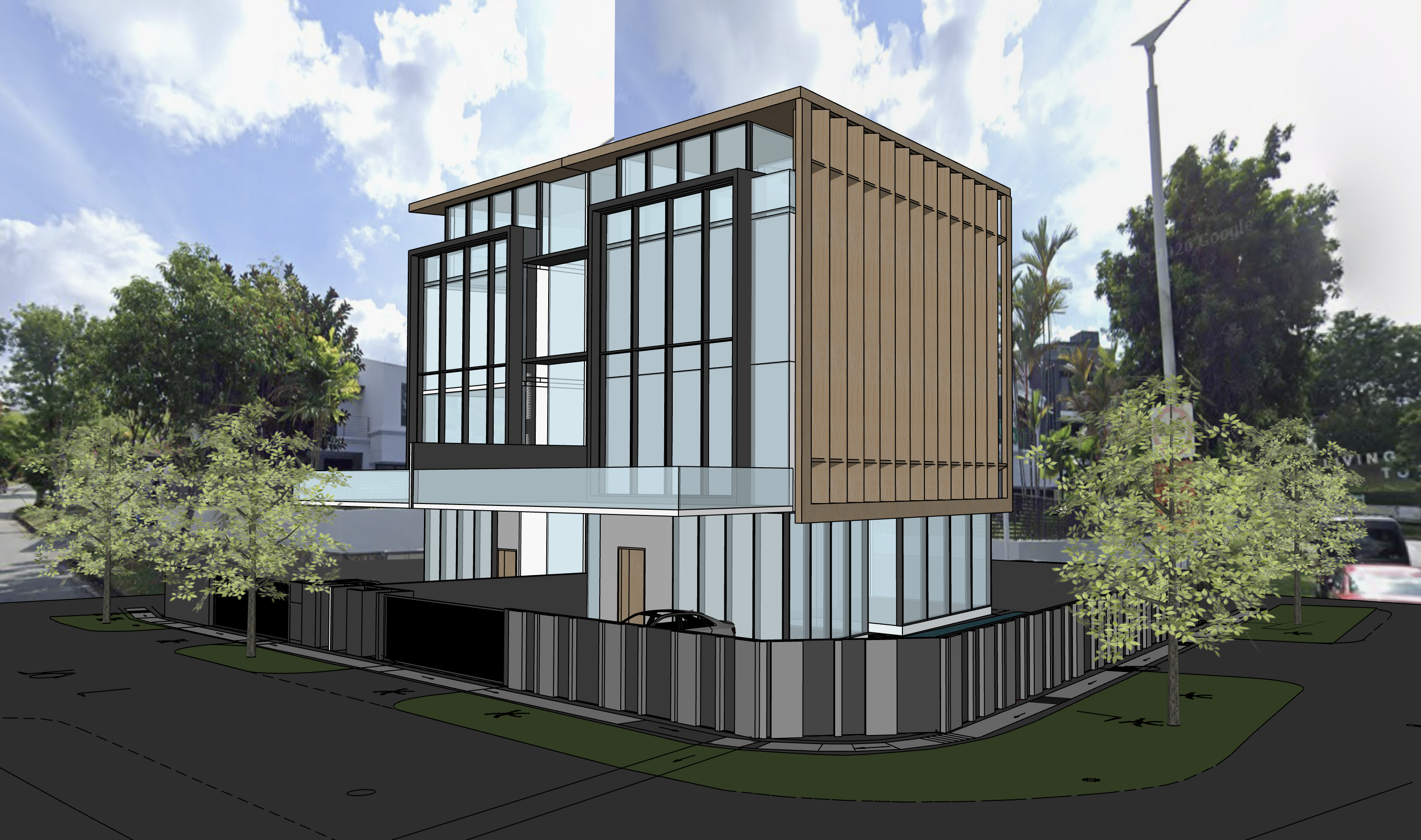 enhance this rendering with photorealistic quality improve light add realistic textures and sharpen details strictly preserve original architecture layout colors and materials clean modern boundary wall design
