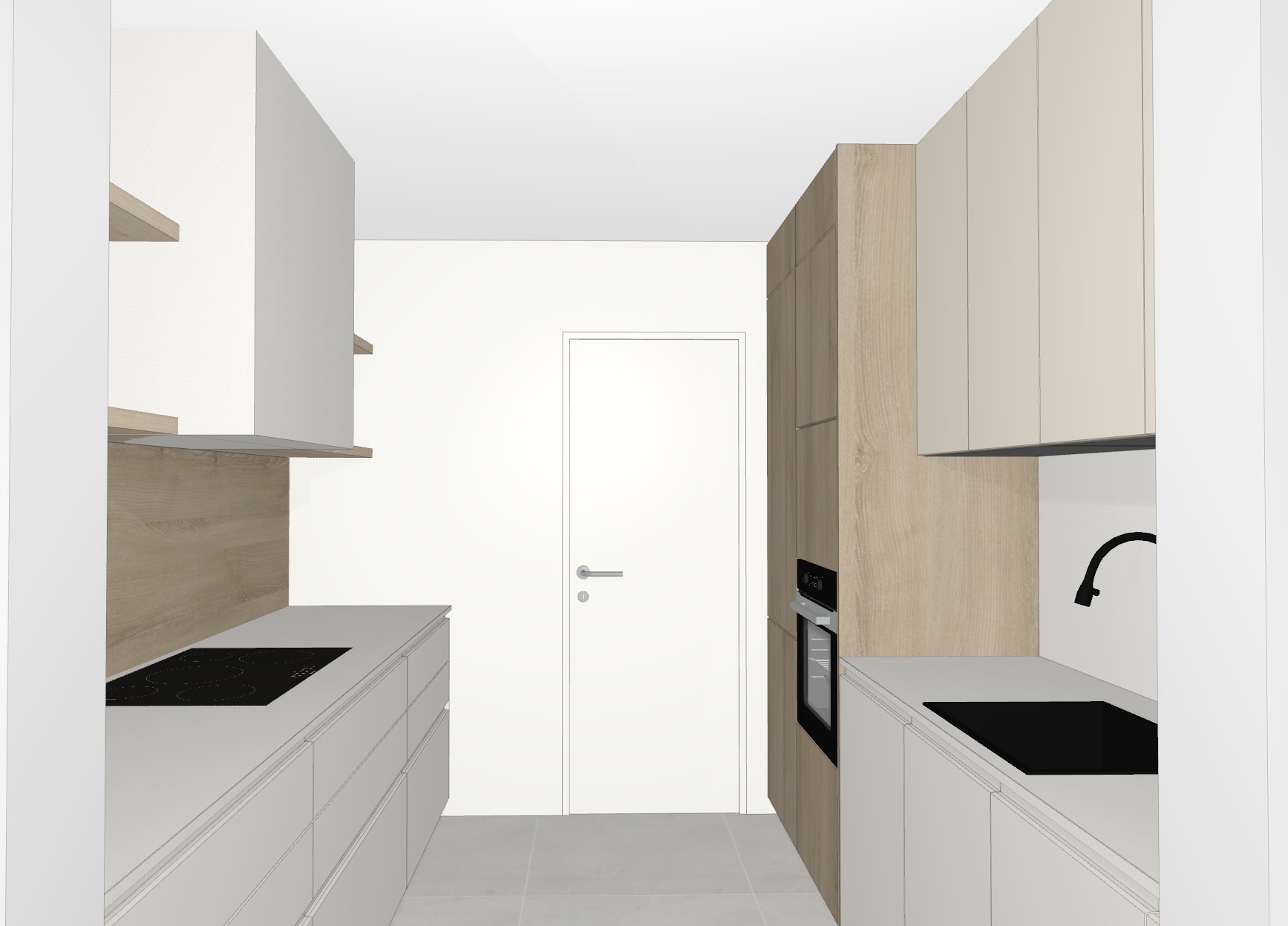 render a modern minimalist kitchen with a sleek and elegant design the walls are soft white creating a clean and bright atmosphere the cabinets are a combination of light modern beige and natural wood adding warmth and texture the countertops are a smooth light gray providing a sophisticated contrast the appliances are sleek stainless steel for a contemporary touch the floor tiles are a subtle gray harmonizing with the overall color scheme the lighting is soft and ambient creating a cozy yet stylish atmosphere
