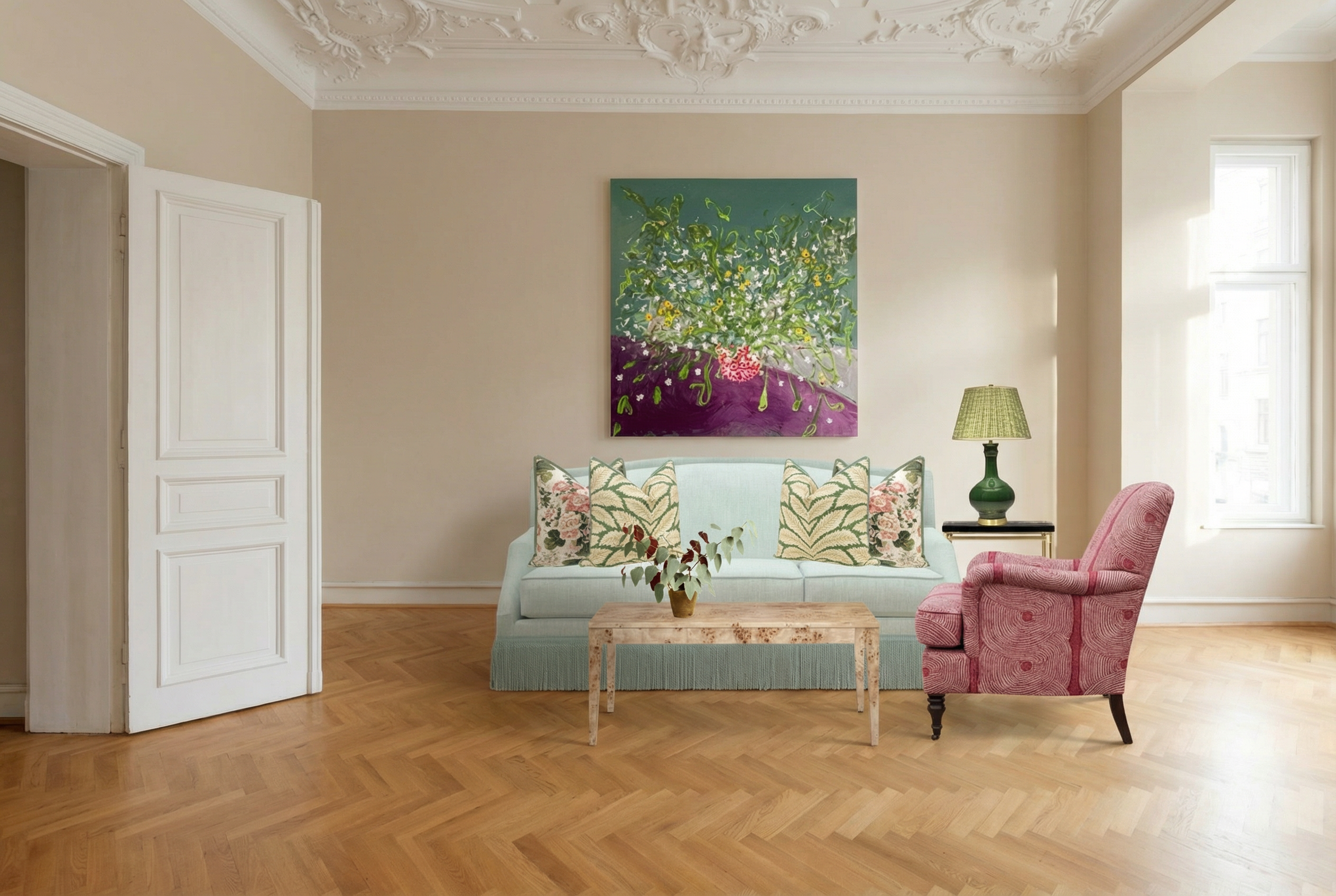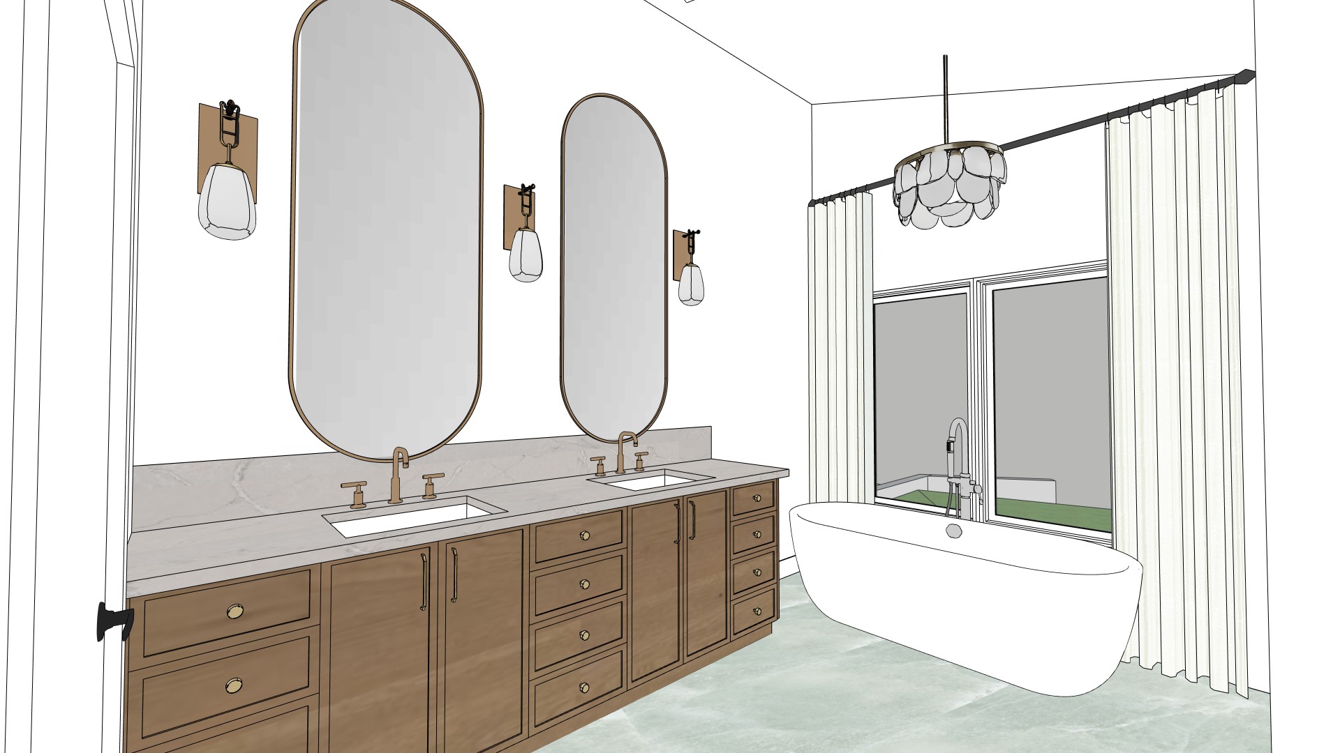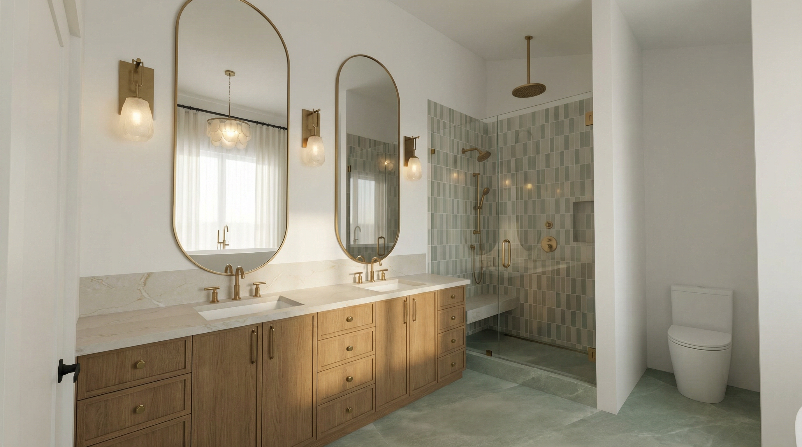 ultra realistic master bathroom interior render warm modern transitional style high end residential spa the camera is positioned inside the bathroom capturing a direct interior view of the vanity and tub area general space spacious master bathroom with white walls and a soft vaulted ceiling clean bright and refined floor finished in large format stone or porcelain tile in a soft sage pale green tone matte finish with subtle natural variation vanity area a long custom double vanity in natural medium tone oak wood with flat recessed panel doors and drawers clean and timeless detailing vanity features light stone quartz countertop with subtle warm veining matching stone backsplash running the full length of the vanity two undermount rectangular sinks brushed brass widespread faucets with clean minimal lines brass cabinet hardware round knobs and slim pulls above the vanity two tall arched mirrors vertically oriented thin brushed brass frames evenly spaced and aligned with each sink mounted beside the mirrors wall sconces with warm brass backplates slim black mounting detail soft white frosted glass shades warm ambient glow not harsh tub area to the right of the vanity freestanding white oval soaking tub smooth matte finish positioned directly in front of a large window with black frame window treatment sheer white floor to ceiling curtains black curtain rod soft natural daylight filtering through the fabric above the tub statement pendant light organic sculptural design layered translucent glass elements soft warm glow centered over the tub tub faucet brushed brass floor mounted minimal modern form lighting atmosphere natural daylight late morning or early afternoon soft shadows warm highlights on brass fixtures balanced exposure calm spa like mood camera realism rules eye level interior perspective slight wide angle 24 28mm straight verticals no distortion accurate proportions and scale material realism visible wood grain on vanity subtle stone veining on countertop soft fabric translucency on curtains accurate brass reflections not overly glossy realistic matte finishes overall mood elegant serene timeless high end residential spa bathroom render quality ultra high resolution photorealistic interior design magazine quality professional architectural visualization