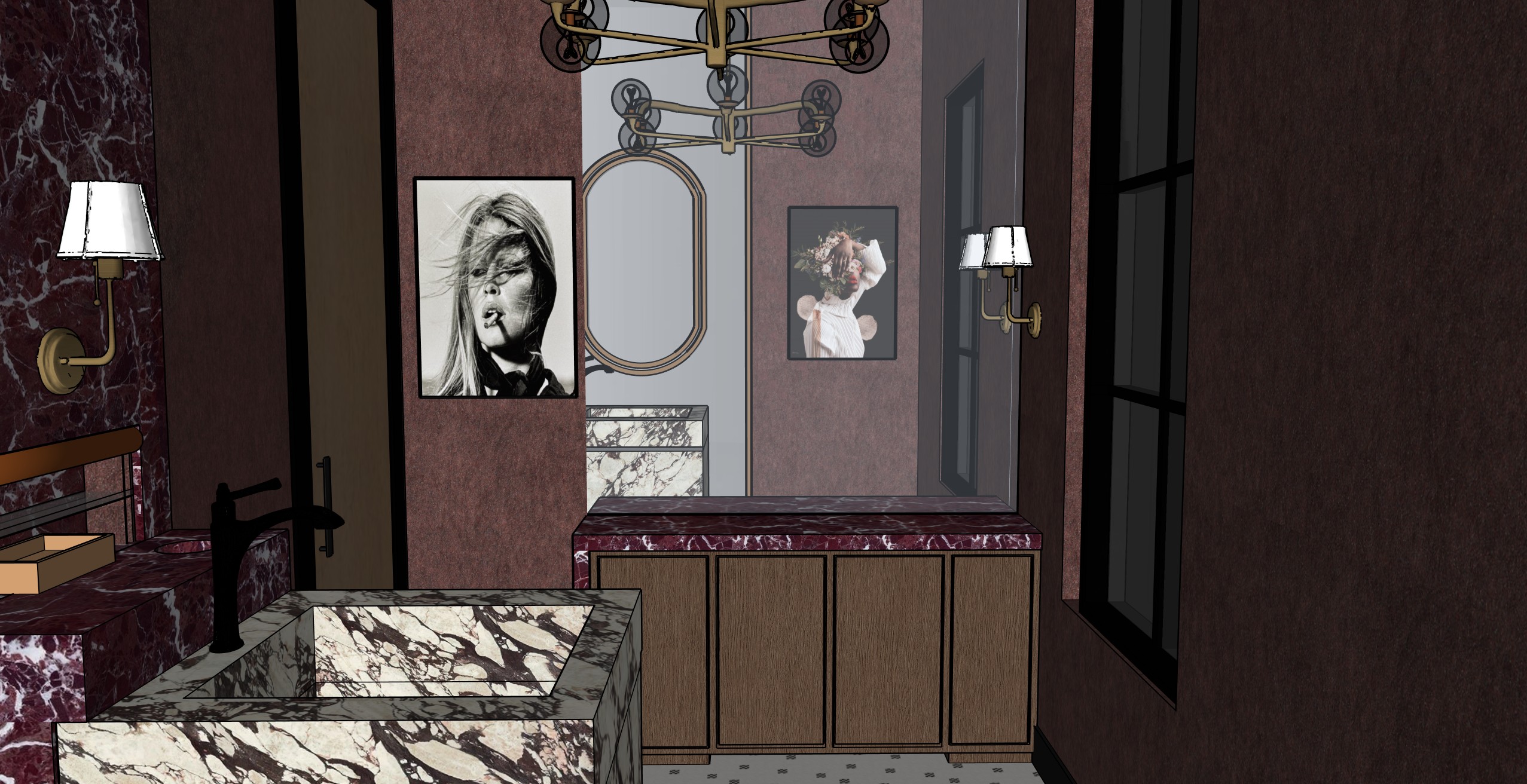 this is a bathroom with no visible ceiling ceiling matches wall colors gold mirror frame is on top of a mirrored wall