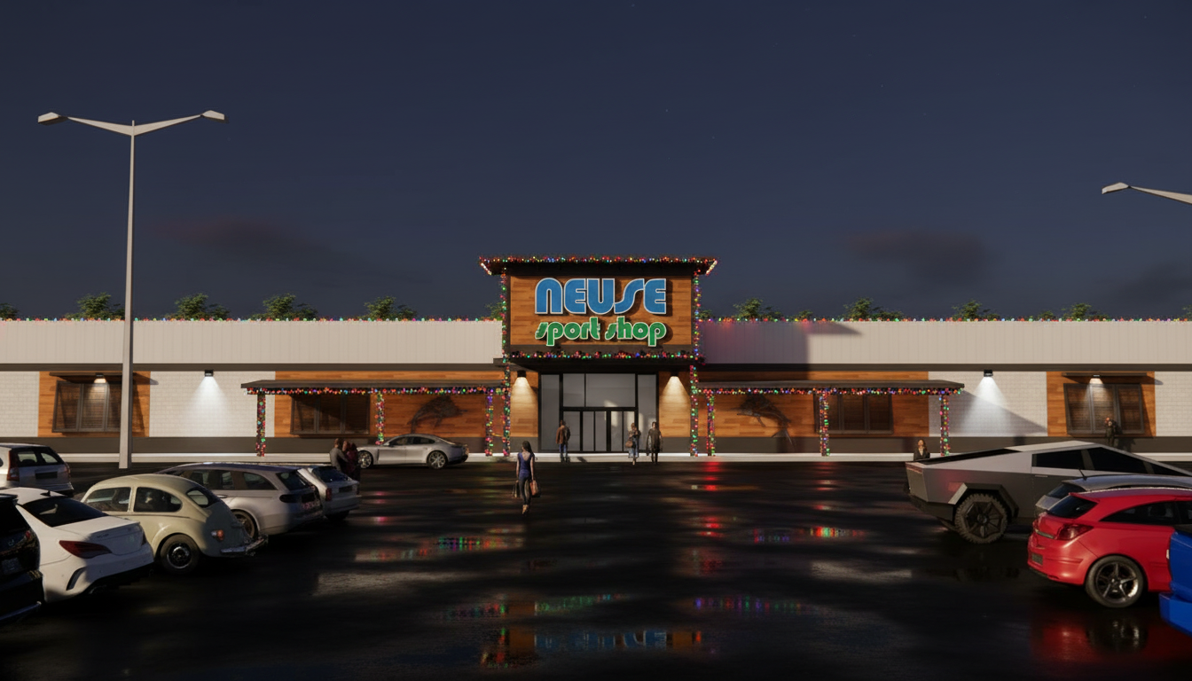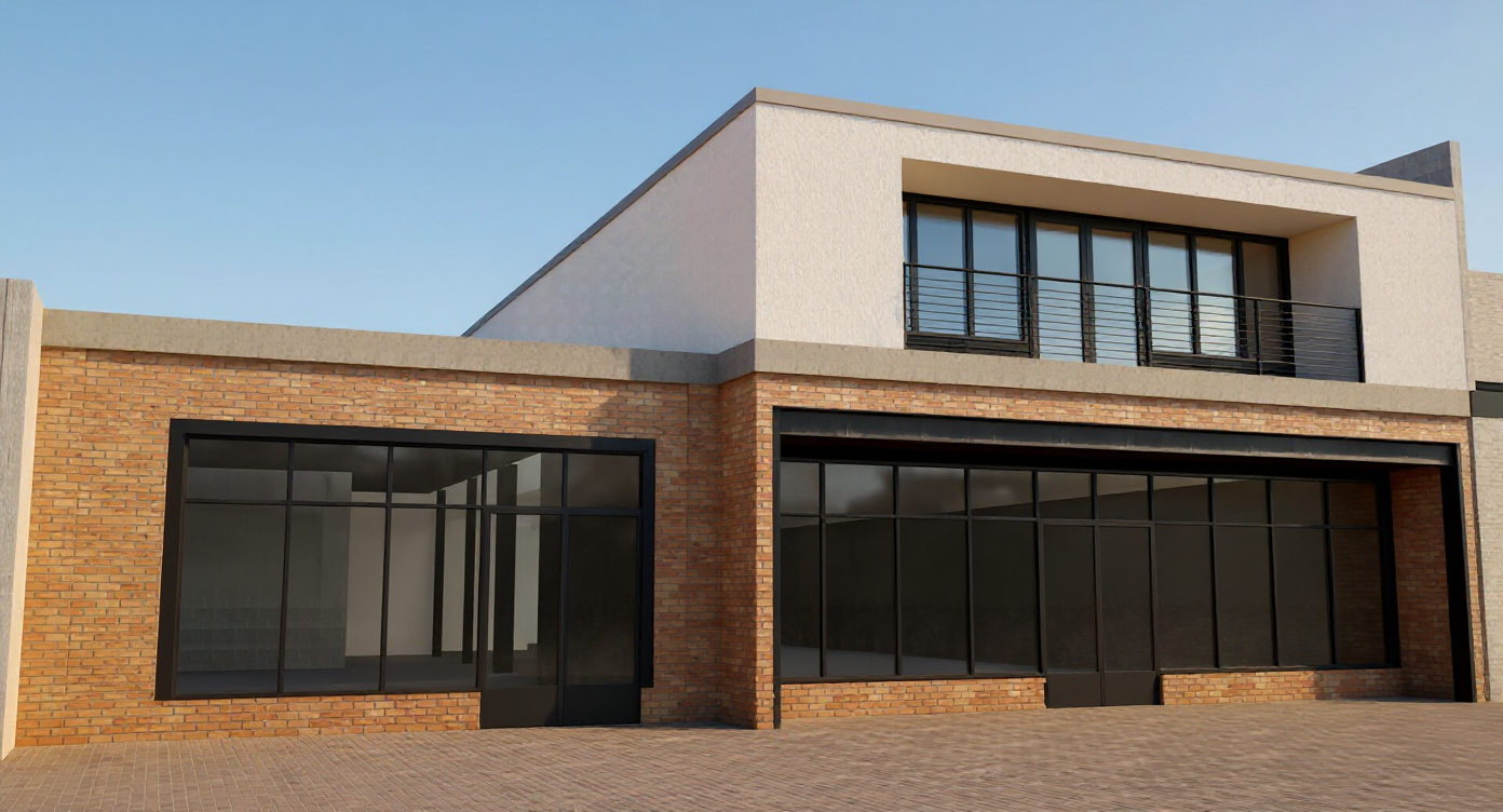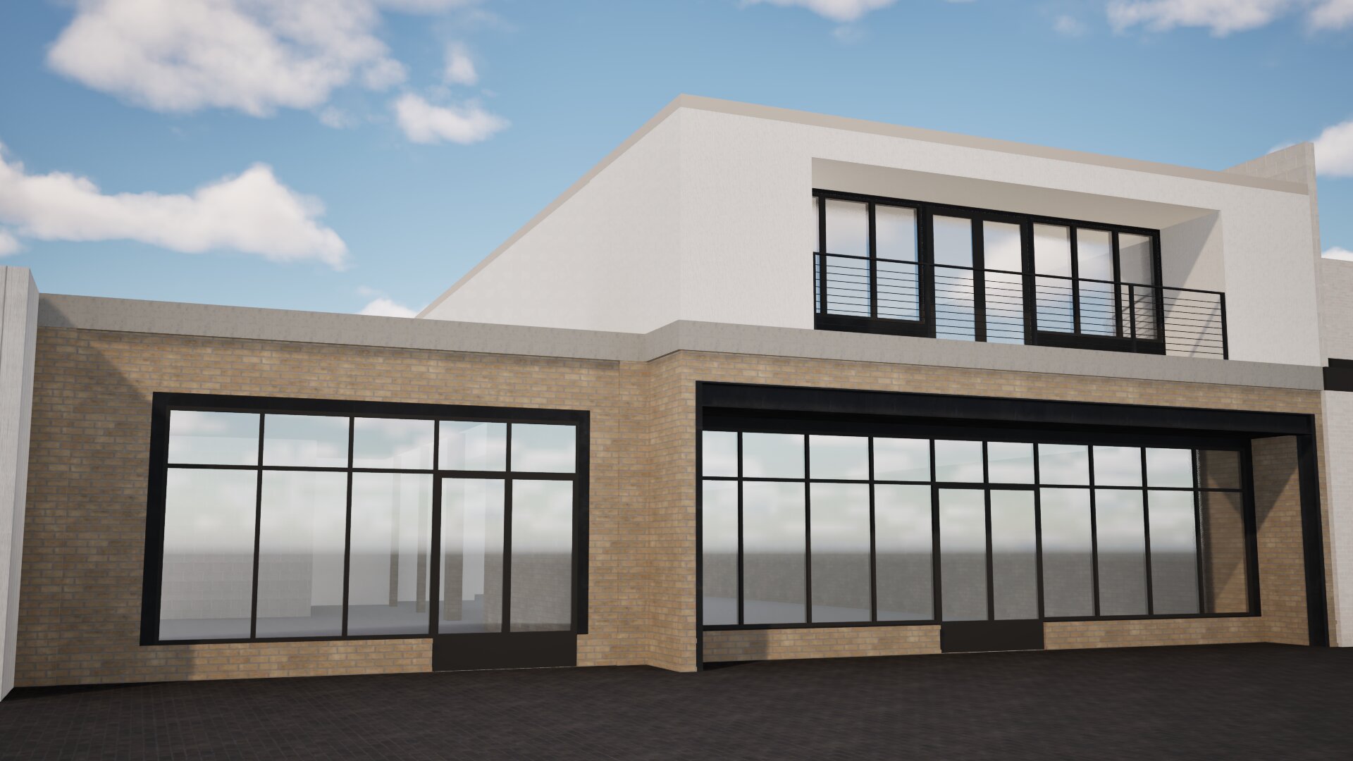 this is a rendering of a storefront renovation make it appear more photo realistic while maintaining color and materials the foreground is to remain brick the main level of the building is to remain orange brick the upper level is stucco that is painted beige add some landscaping to the left of the left storefront render realistic clouds above in the blue sky make the glass a little more reflective and opaque but add interior lighting elements to make the store appear open for business