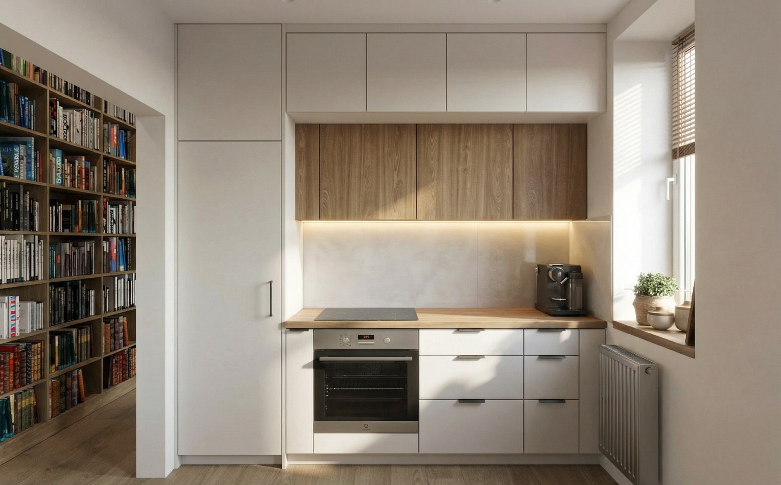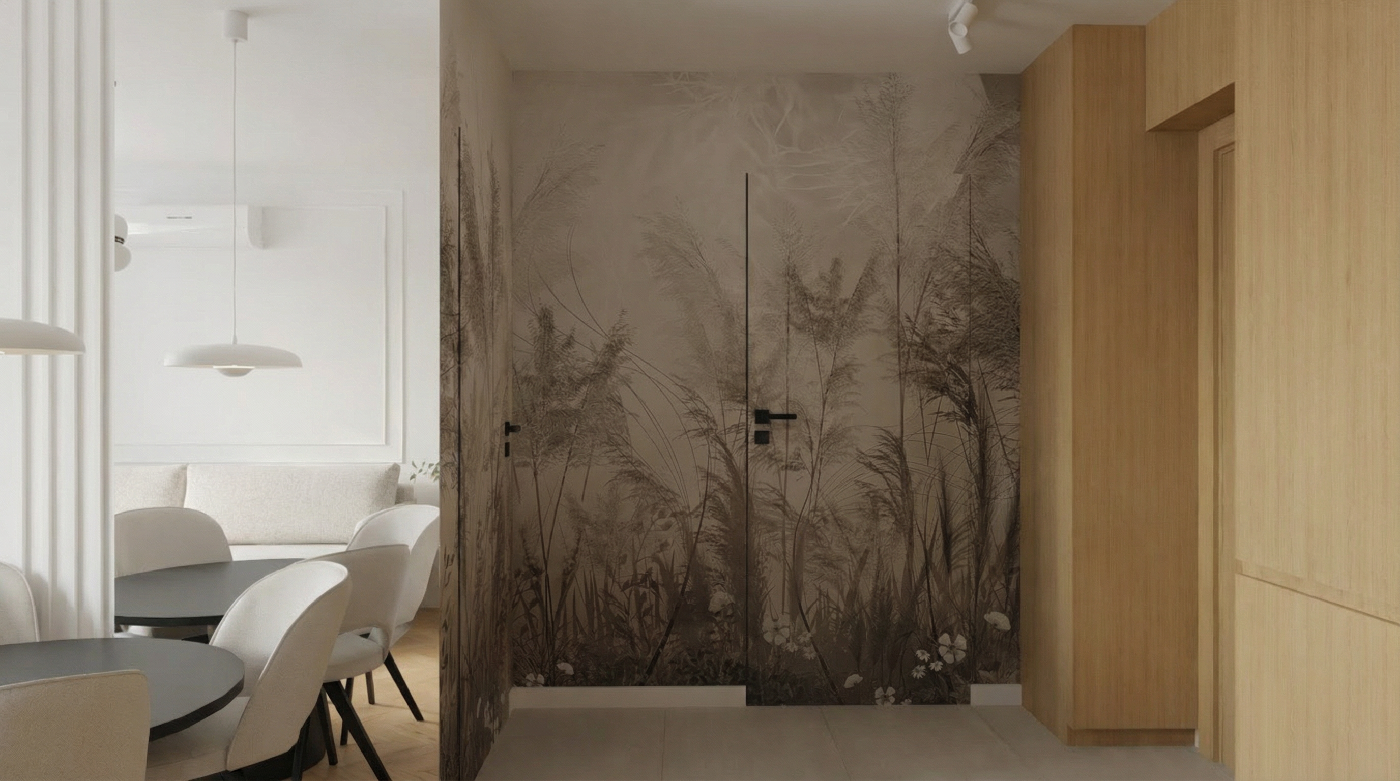 as a continuation of the exterior fa ade this area features an outdoor living and dining space with a travertine dining table as the central element a pergola in a sand tone is positioned above providing shade while maintaining the light neutral aesthetic of the composition behind the main view a built in sofa is integrated into the structure finished with off white waterproof cushions and complemented by decorative dusty olive green linen accent pillows arranged in a clean and elegant manner on the right side there is a built in bbq in a beige finish detailed with linear wooden handles as shown in the reference