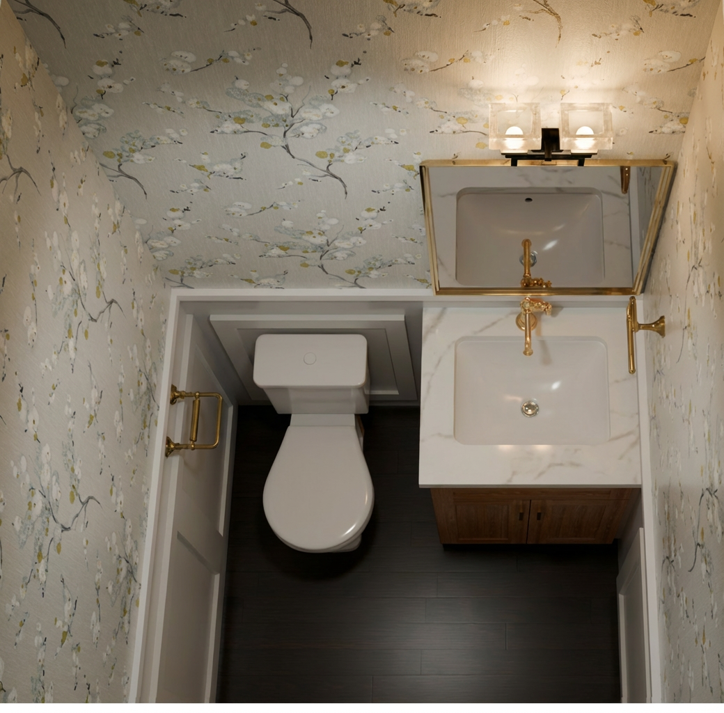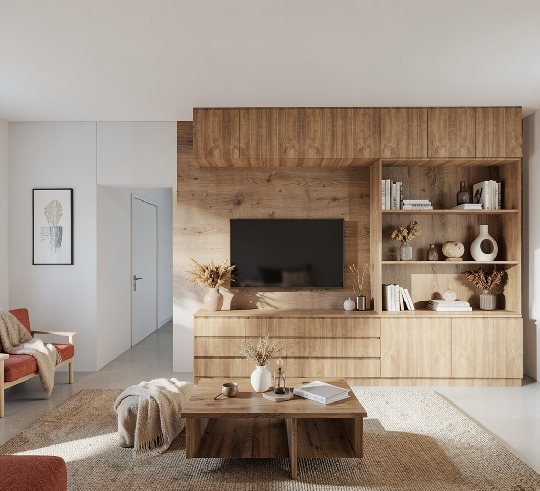 remove overhead cabinet door and leave open shelf space add one long cabinet door on right end near hallway