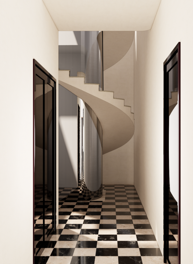 put a gio ponti inspired metal railing on the staircase and clad the column in dark wood